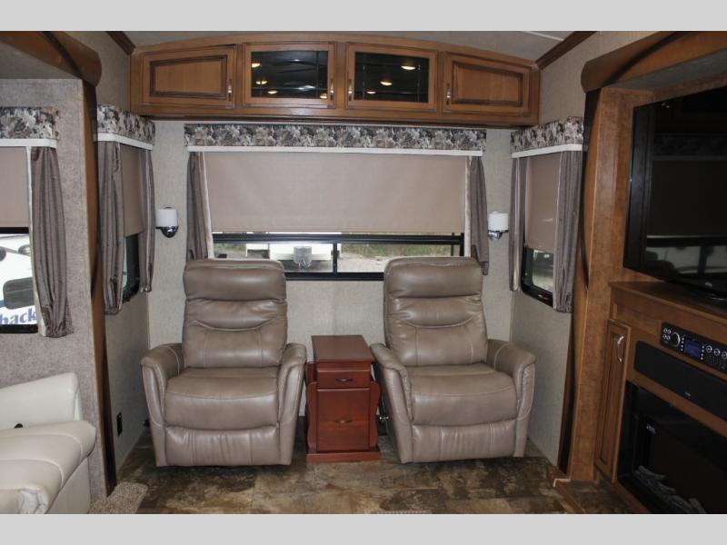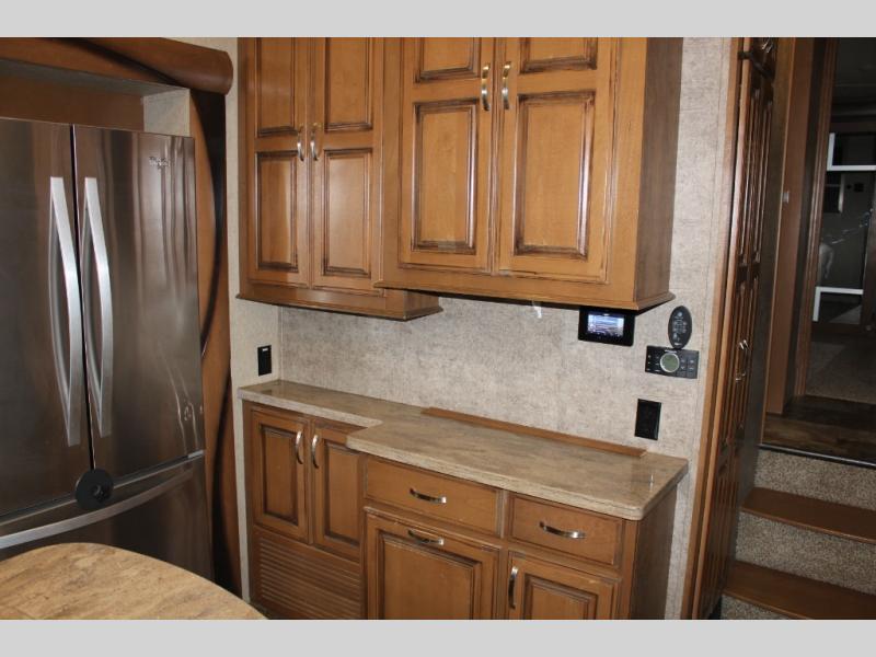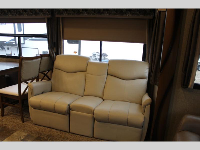 Two generous slide outs are located in the main living/kitchen area right inside the door. To your immediate left as you step inside find a slide out which offers a free standing dinette and two chairs, plus two lounge chairs. Along the rear wall you will find a sofa, plus overhead cabinets that run the entire width of the unit. Continuing around to the road side, another slide out features a fireplace and an entertainment center. This slide also features the kitchen appliances.