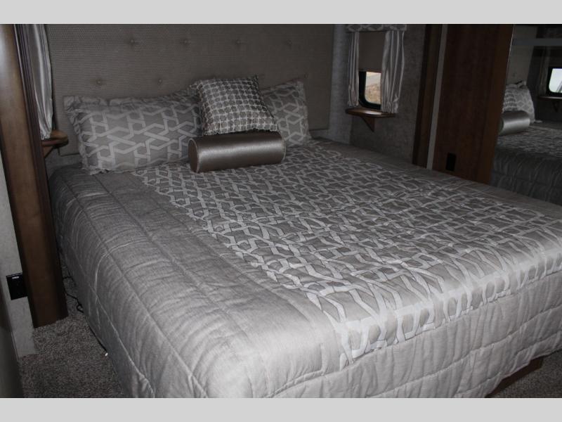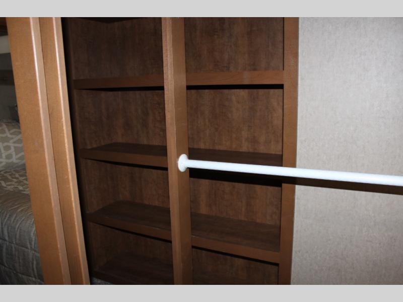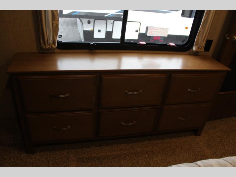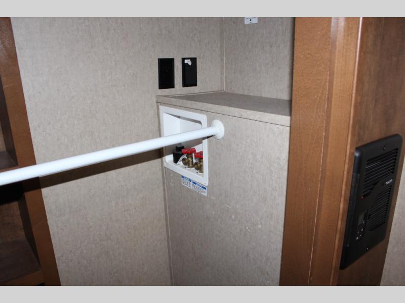 The private front bedroom offers a queen bed slide out with a shelf on either side, or you can choose an optional king size bed if you need a bit more sleeping space. There is also a dresser opposite of the bed along the curb side wall, and a full width wardrobe with shelves and drawers for all of your storage needs. In corner of the wardrobe you will find that it has been washer/dryer prepped for your convenience, plus so much more.