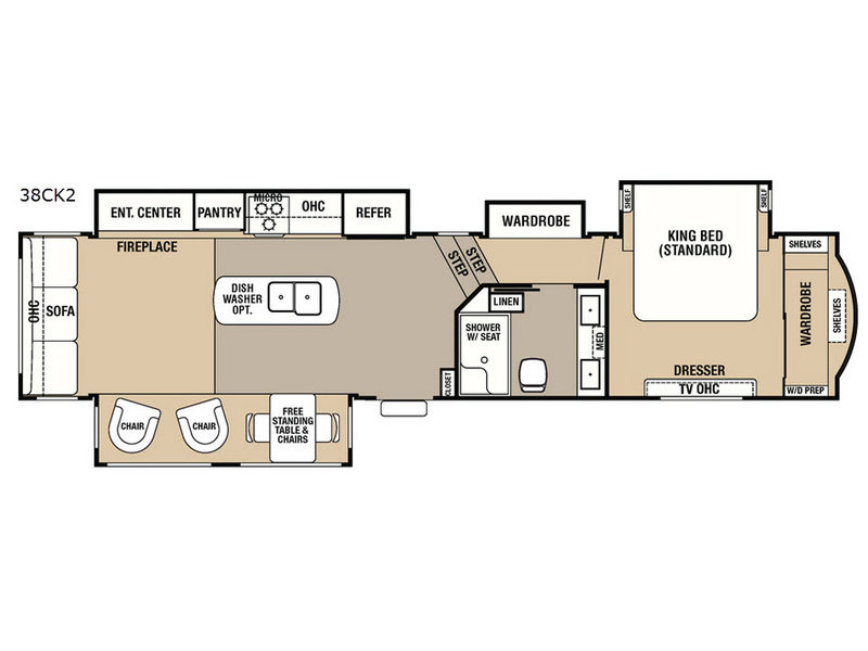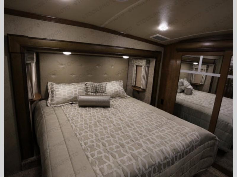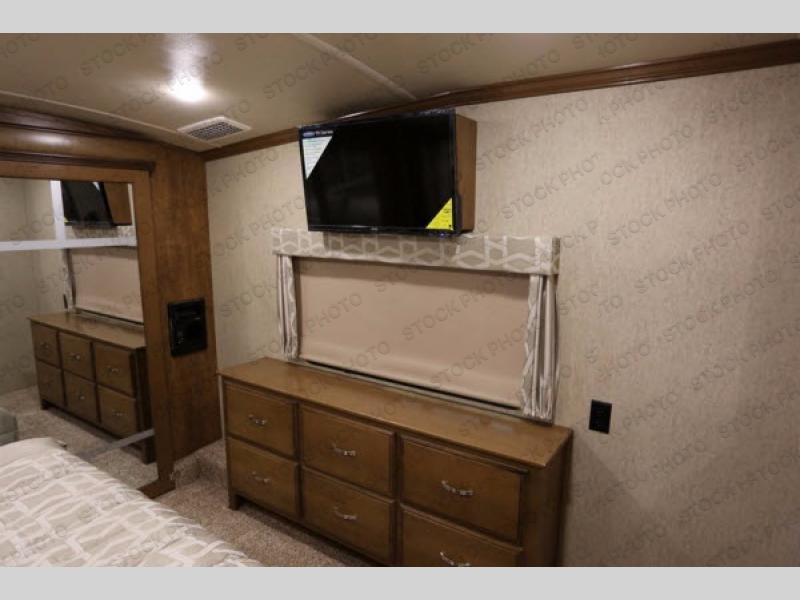 In the bedroom you will find a queen bed and nightstands that are part of the bedroom slide. If you like you can choose a king size bed in place of the queen. Opposite along the curb side there is a dresser with TV above, and a front wardrobe with sliding doors for all of your clothing needs including shelves, and a washer/dryer prep, plus so much more!