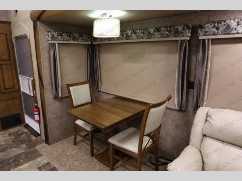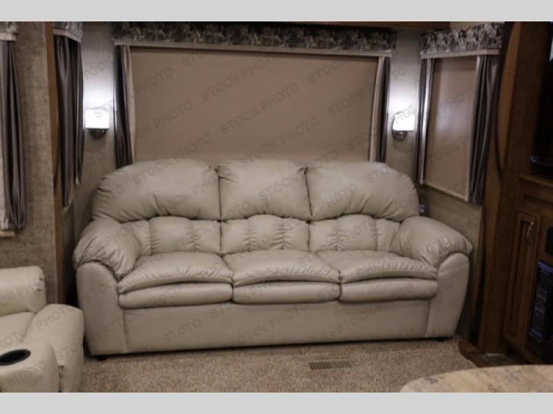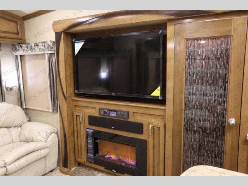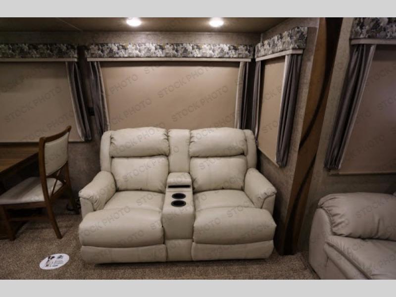 Step inside and notice how open it feels thanks to dual opposing slides in this area. To the left there is a free standing dinette with two chairs, and two lounge chairs. Along the rear wall there is a sofa, plus storage above to keep things neatly tucked away and organized. Adjacent to the sofa is a second slide out along the road side that features an entertainment center with fireplace. This slide also features the kitchen appliances.