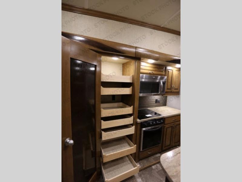 When it comes to cooking while you travel this Cedar Creek Hathaway model has you covered. There is a pantry, a three burner range including microwave oven, extra counter space, and a refrigerator all within the slide. In the center of the kitchen you will find a handy island that includes a double sink for cleaning up, and you can add an optional dishwasher so you can spend more time relaxing while letting the dishwasher do your cleaning!