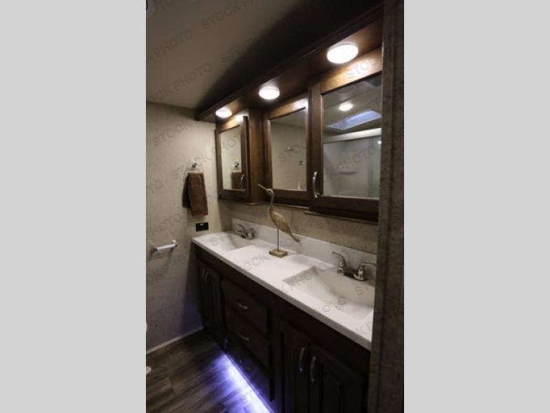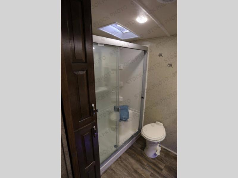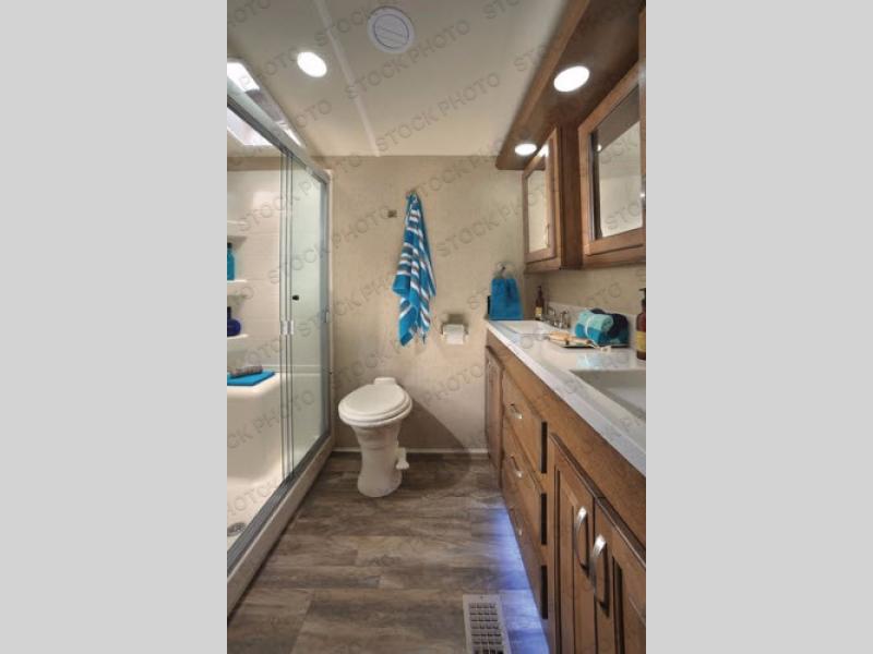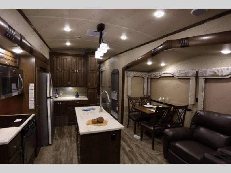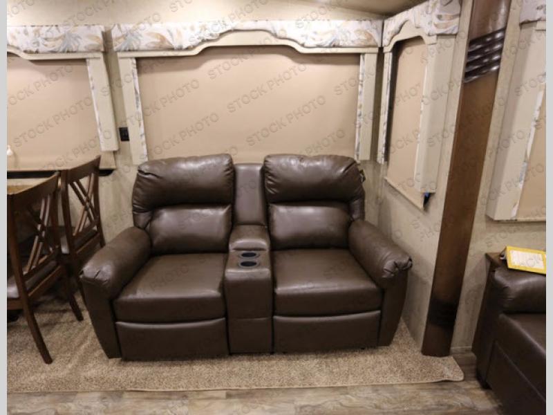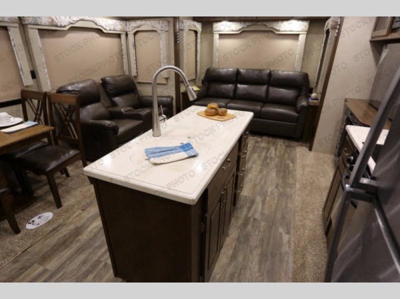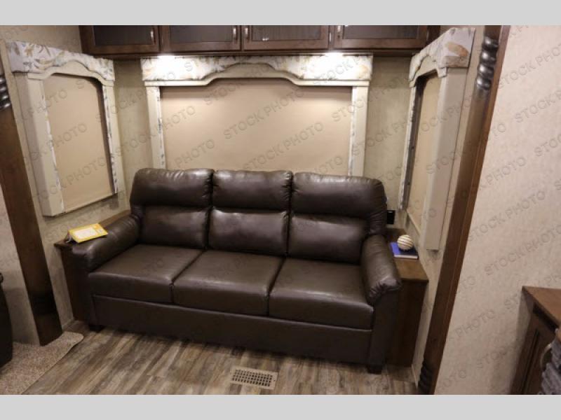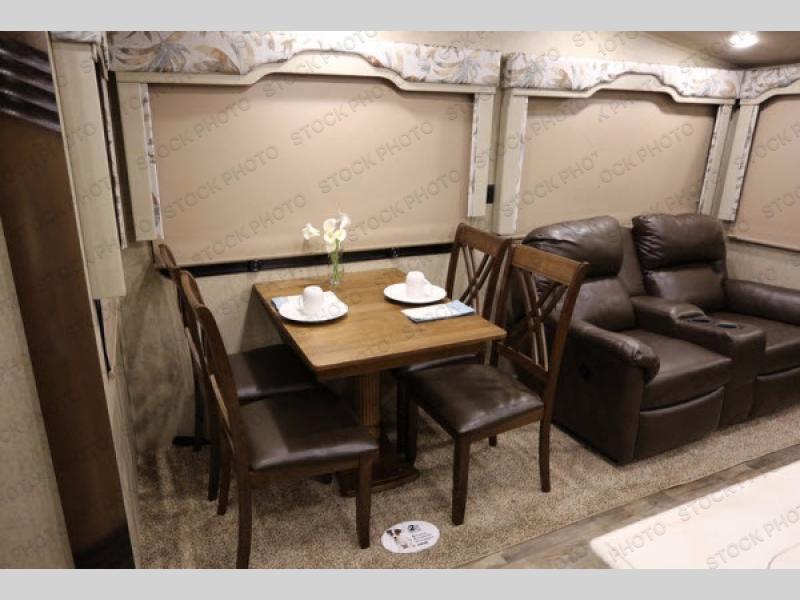 As you enter you will be impressed by the floor space in this unit. There are dual opposing slides in this space alone with a free standing dinette and two lounge chairs to your immediate left. Across the back of the unit you will find a sofa with end tables, and overhead storage the entire width. All of this seating, whether for dining or just hanging out visiting and watching TV, creates a comfortable environment for everyone camping.