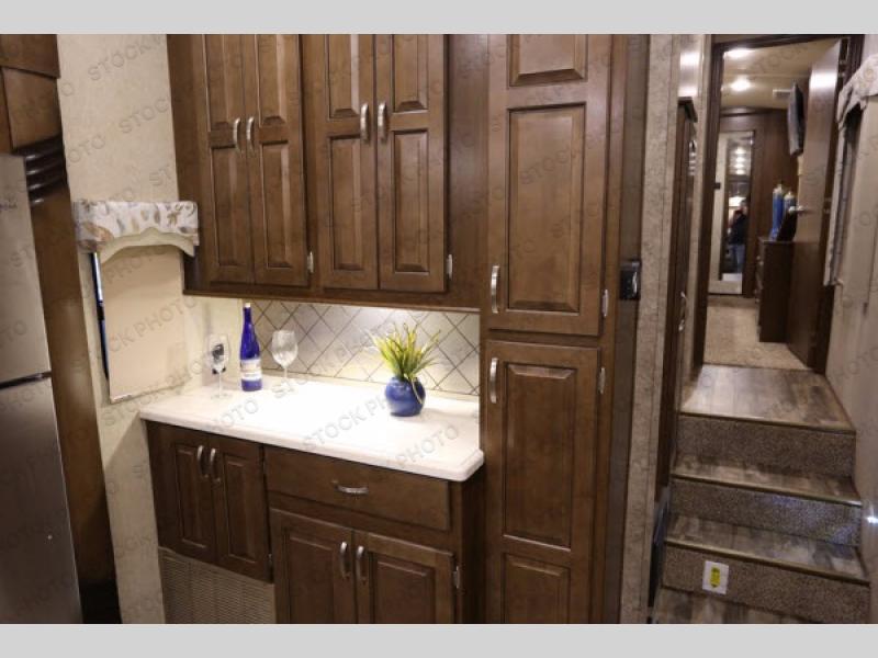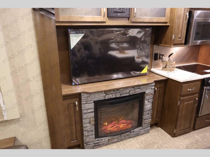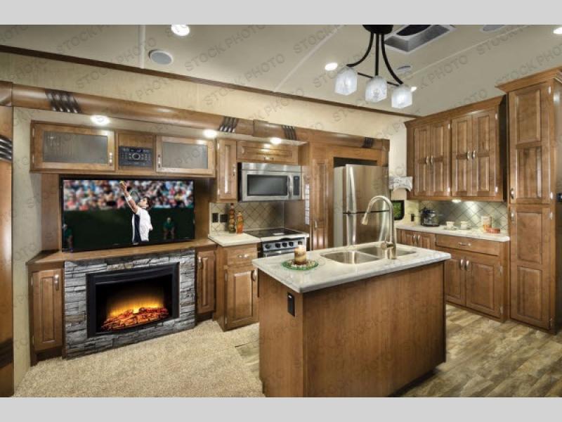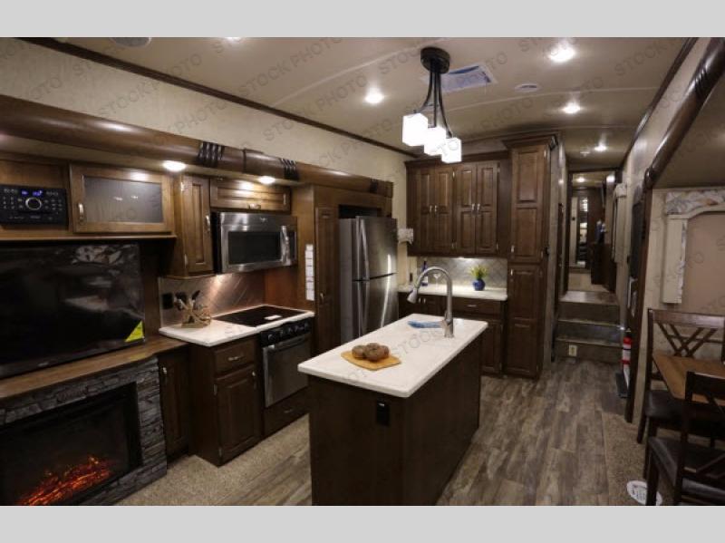 When it is time to cook you will find this Silverback Edition kitchen in perfect order. There is a refrigerator, a food pantry, and a three burner range with overhead microwave oven in a slide out opposite the entry door. This slide also features a 48" LED TV with fireplace, and storage overhead so you can tuck away all of your things neatly out of the way. There is also a center island which provides added prep space, and a double sink. Along the interior wall you will find added counter space and storage cabinets, plus a closet for your coats.