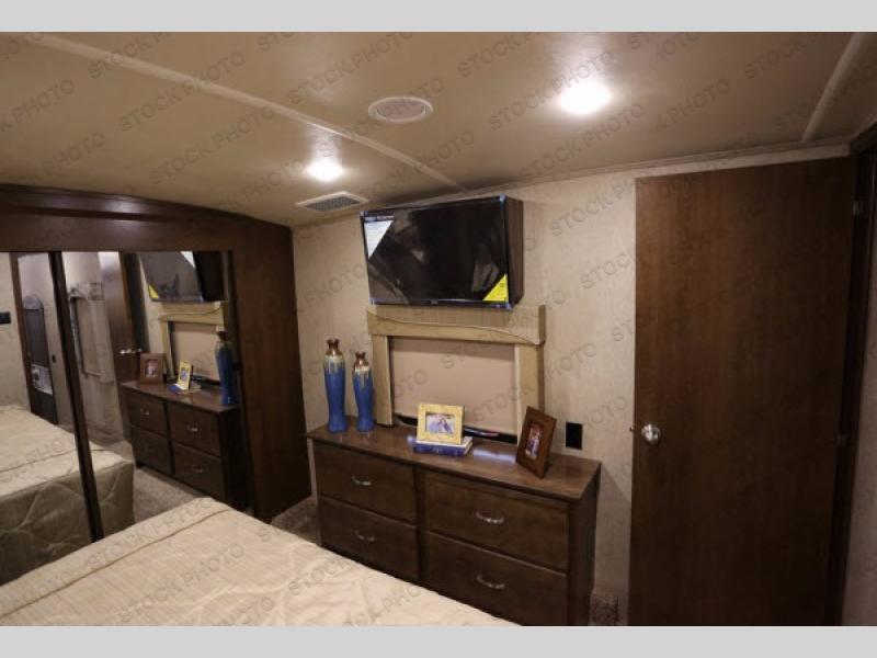 Continue toward the front where you will find the perfect spot to unwind, and sleep comfortably. You will enjoy the added space thanks to a slide out queen or optional king size bed. Like the living space this slide features cathedral ceiling styling. There is a dresser for your clothing opposite the bed, and a full front wardrobe with drawers, shelves, and a place for all of your hanging clothing. You will even find that it has been prepped for a stackable washer and dryer if you choose to add, plus so much more!