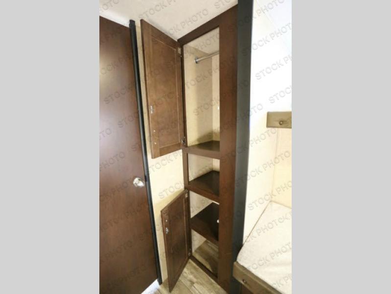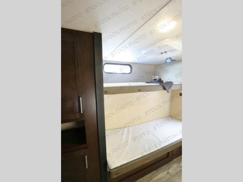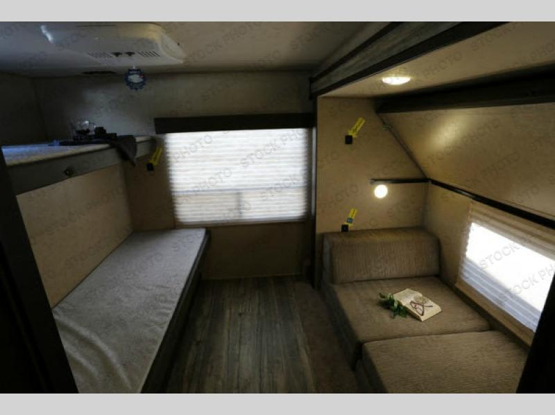 The rear bunk house has a slide out cube sofa on the bottom and a flip-up bunk above. Along the opposite side of the trailer you will find a set of bunks and a wardrobe next to the bunks. Along the rear wall there is also a LCD TV mount.