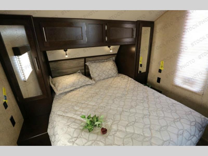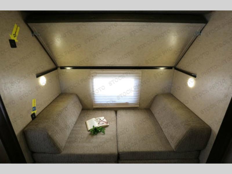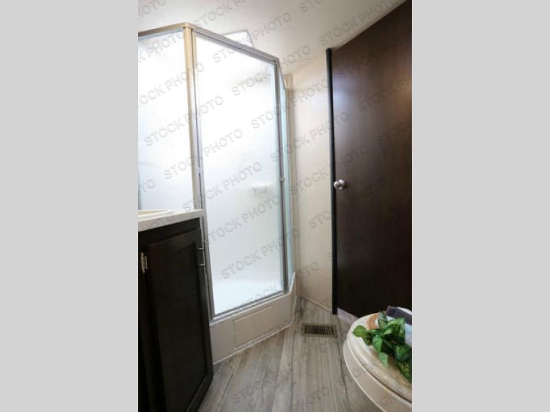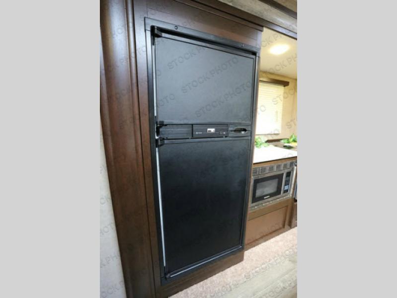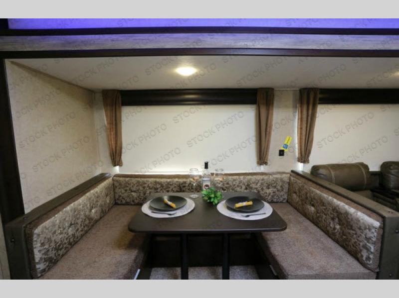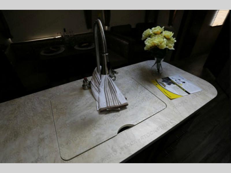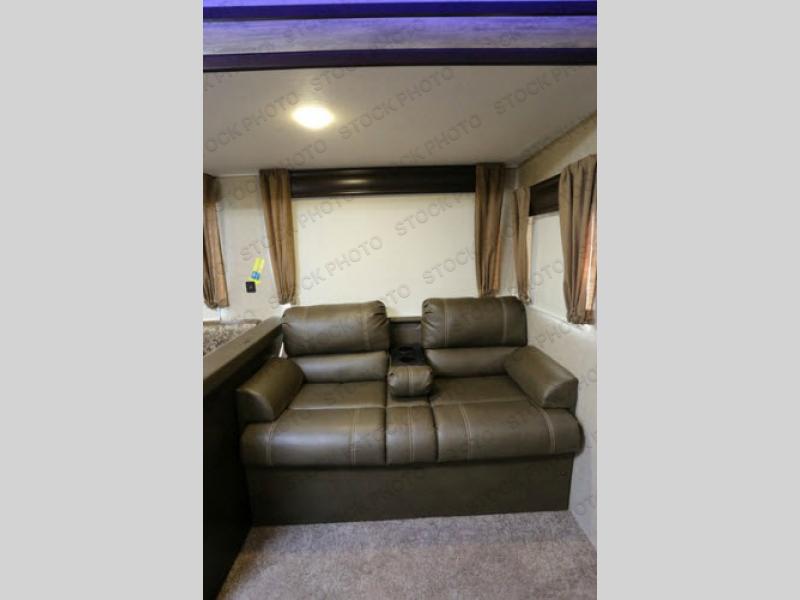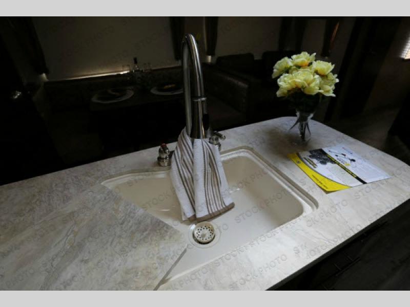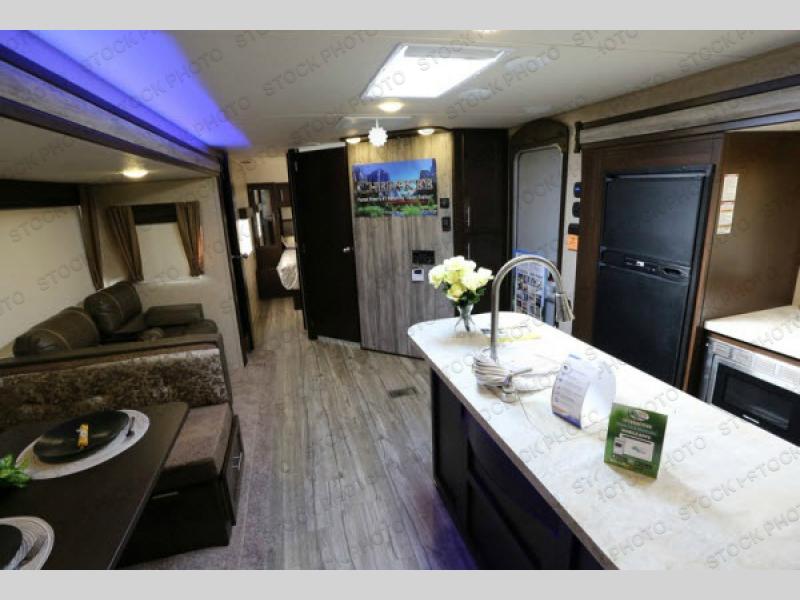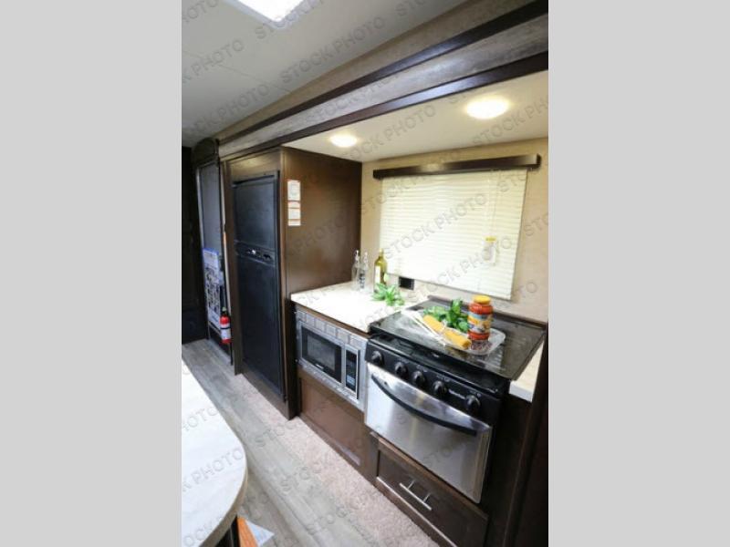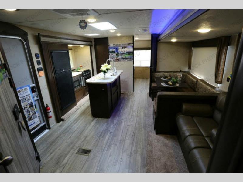 As you enter the travel trailer, to the left there is a slide with a refrigerator, three burner range, and microwave. Next to the slide you will find a large pantry. The opposite side of the trailer has a slide with a sofa and a u-dinette. There are optional 40" storage drawers below the dinette and an optional skylight above. The kitchen island offers a large sink as well as extra counter space. To the right of the entrance you will find a closet and LCD TV on the outer wall of the bath.