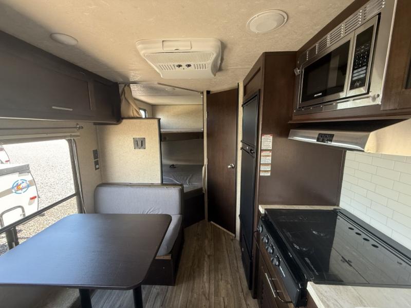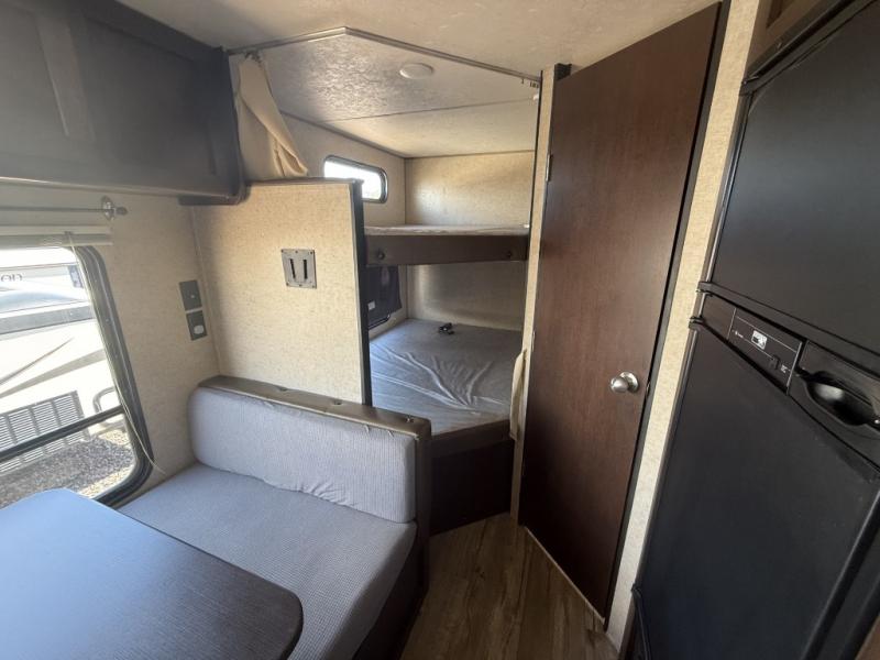 For the couple who is ready to get up and go, then the Cherokee Grey Wolf 17BHSE travel trailer by Forest River is ideal for you. This model features a sofa along the front, and a set of double bunk beds in the rear.