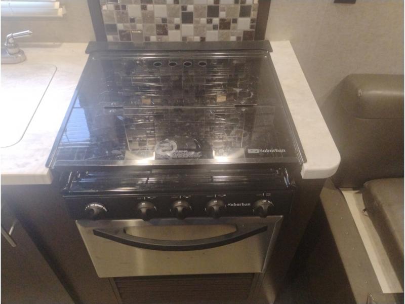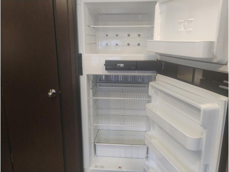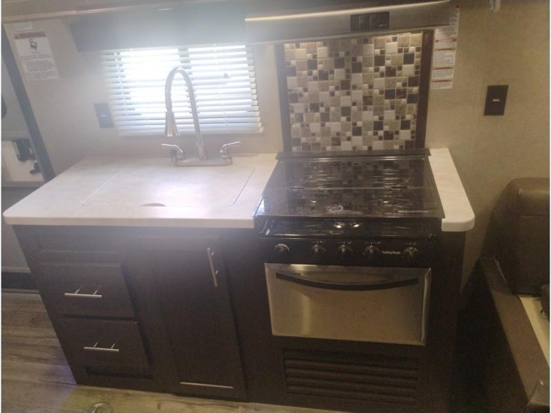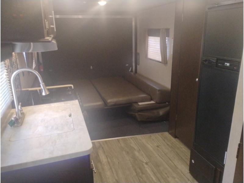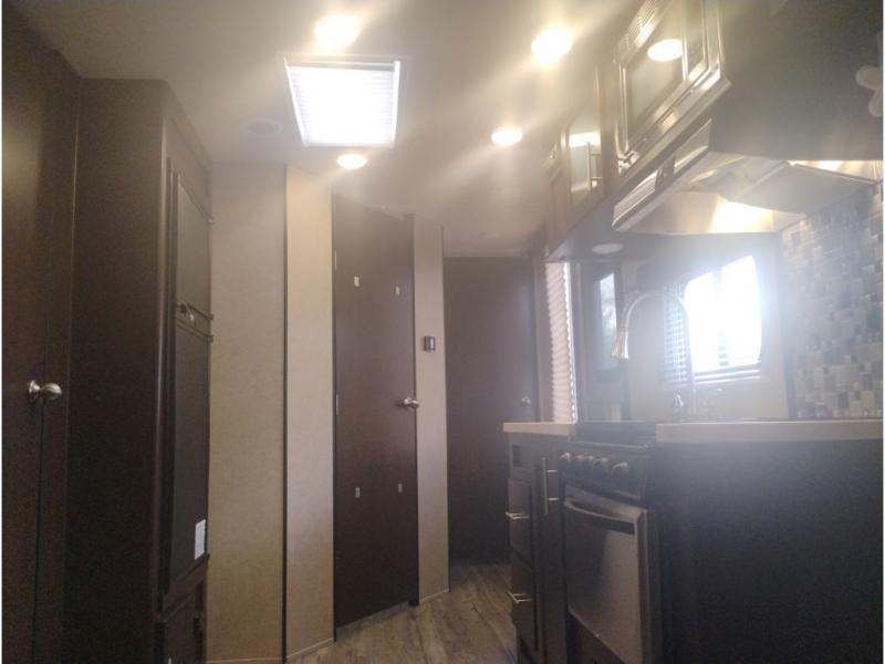 The kitchen area has a three burner range, microwave, and large sink along one side of the trailer. Across from the sink there is a walk-in pantry for your food items, and a refrigerator.