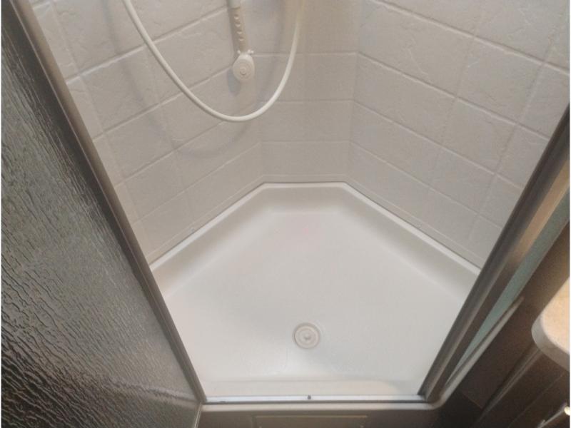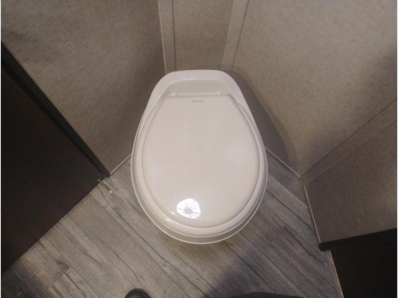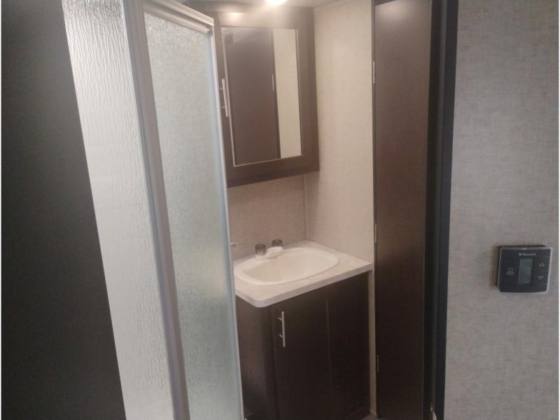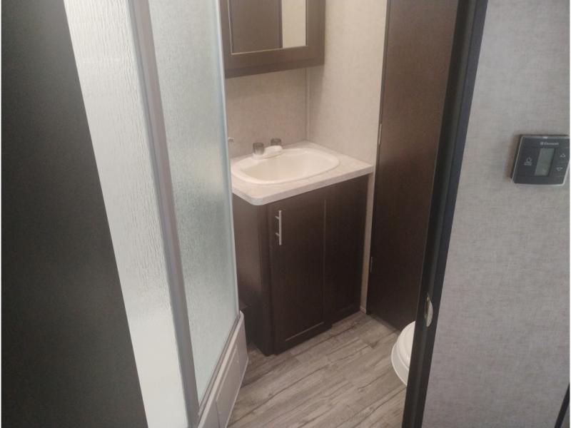 The side aisle bathroom has a neo-angle shower, sink, and toilet. You will also find a private entry door from the bathroom leading into the bedroom.