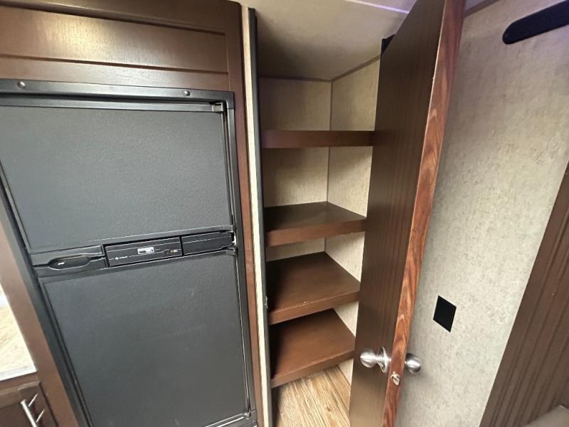 As you enter the trailer, to the left there is a lounge chair. In the kitchen area you will find a large kitchen sink, three burner range, and microwave. Along the rear wall there is a refrigerator, large pantry, and extra counter space for food prep. Along one side of the trailer you will find a u-dinette slide and adjacent to the slide there is an entertainment center.