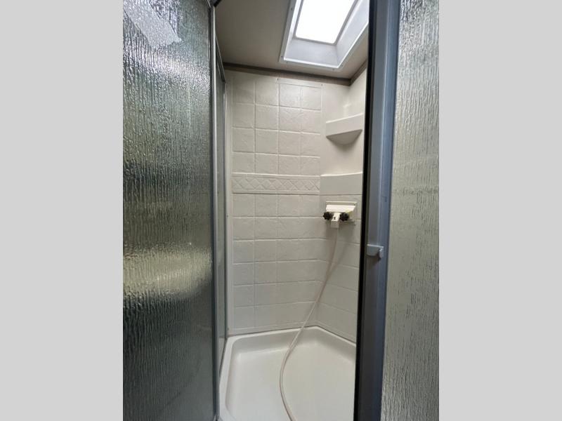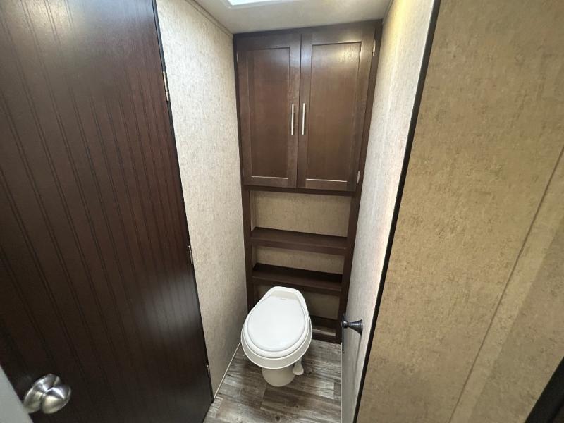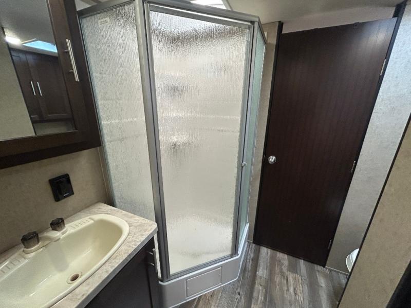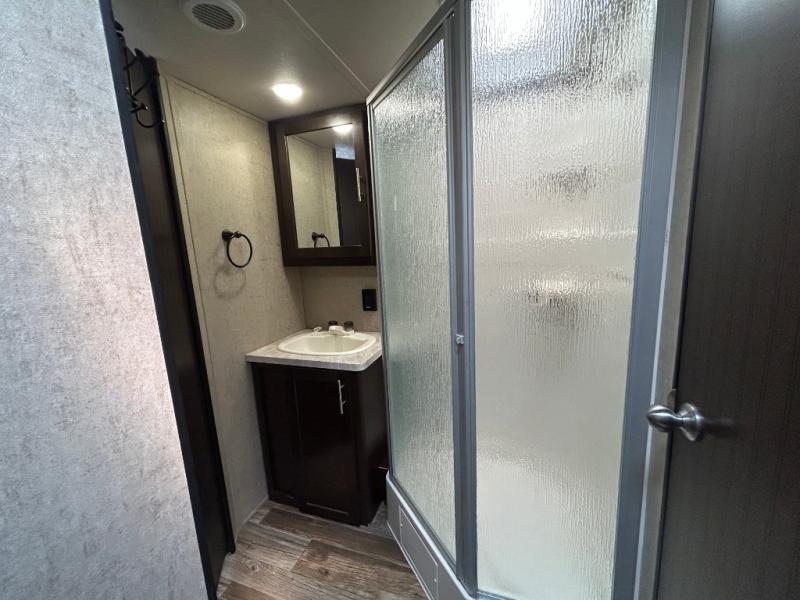 The bathroom is a walk-thru with a sink, and neo-angle shower on one side of the trailer and a toilet and wardrobe on the opposite side.