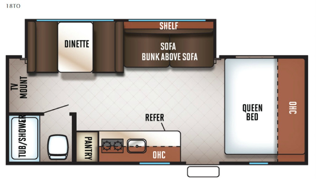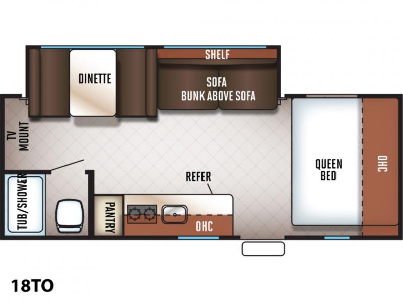 Enter and notice the front queen bed with overhead storage to your right. Straight ahead there is a large slide out sofa with bunk above, and a booth dinette for dining and hanging out. The sofa features a shelf overhead for your things.