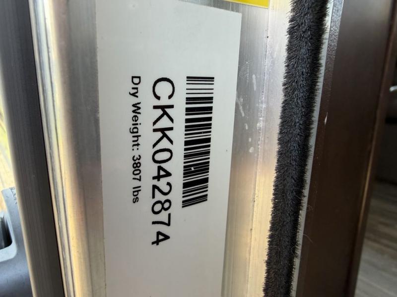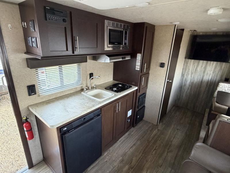 Along the curb side just inside the door you will find a counter top with refrigerator below, a single sink, and a two burner cook-top. You will also find a pantry for food storage needs. The overhead cabinetry will easily keep your daily dishes and kitchen supplies handy.
