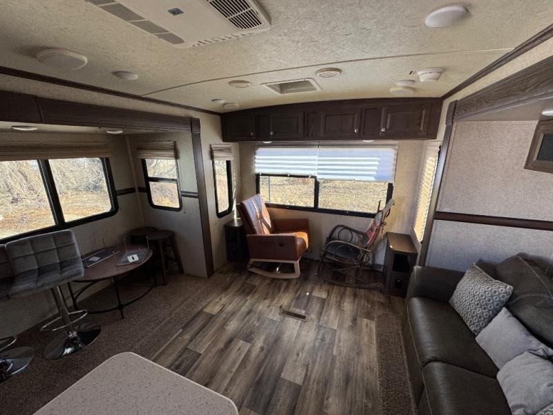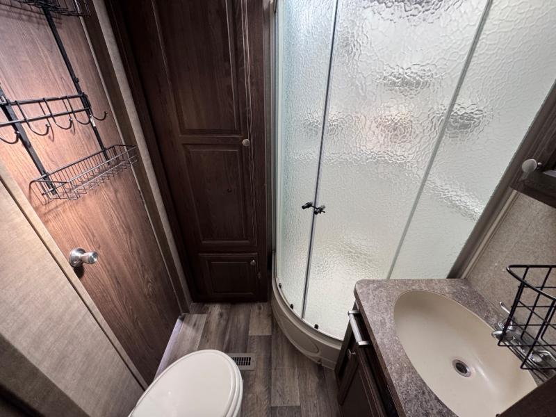 There are plenty of overhead cabinets throughout the inside of the travel trailer, as well as exterior storage. Outside find two awnings, exterior storage, an optional gas grill, plus more!