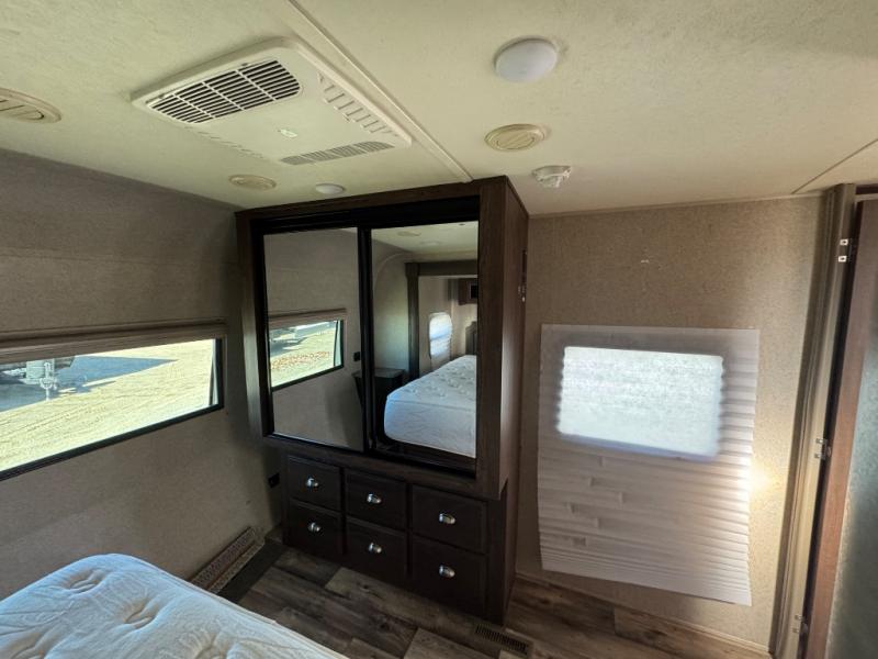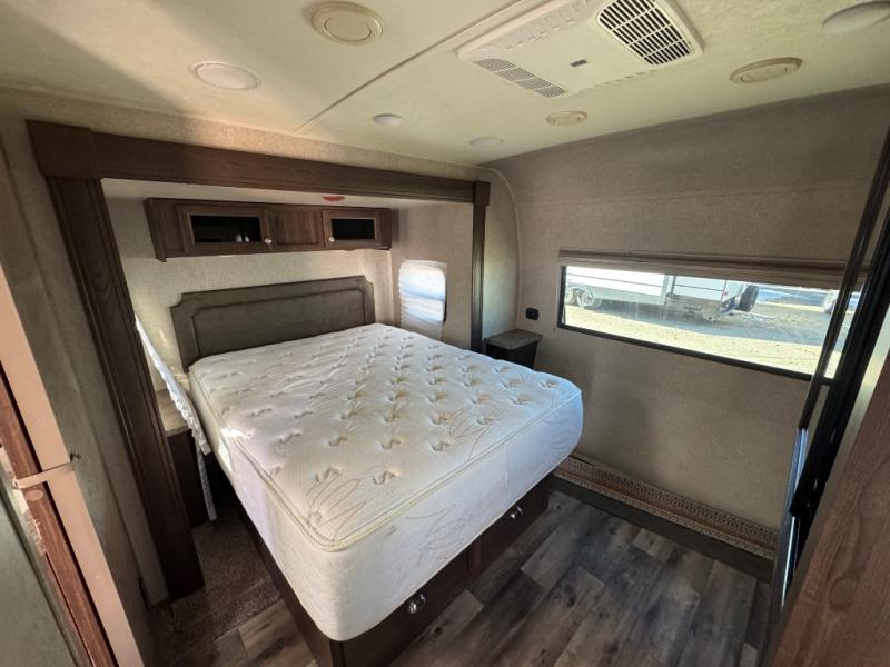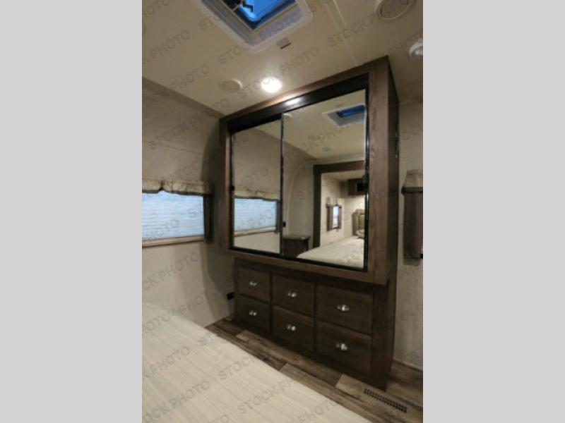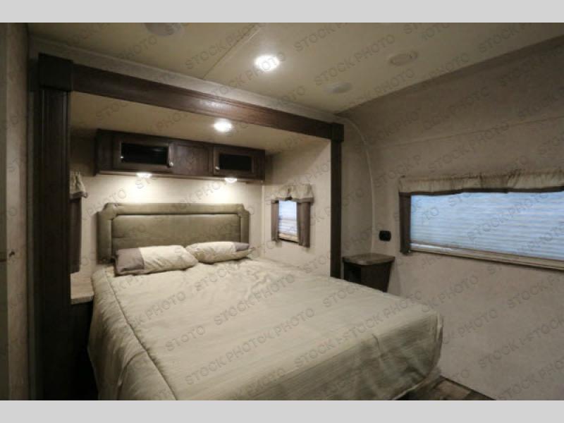 The front bedroom has a slide out with a queen bed and nightstands. Across from the bed there is a large wardrobe and a shelf. If you like, you can choose to add the optional TV which would be located next to the wardrobe.