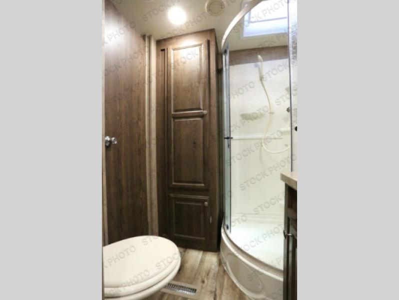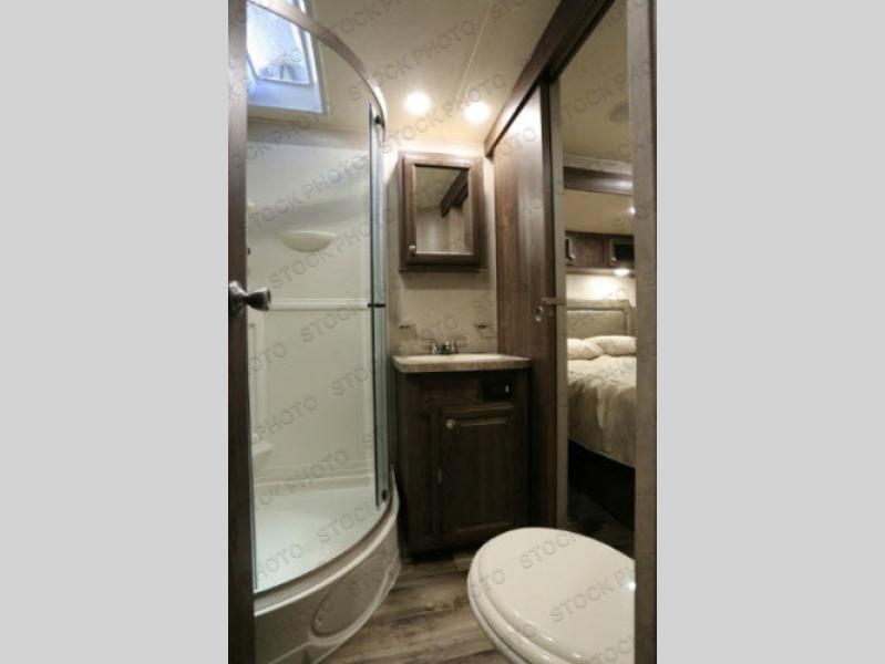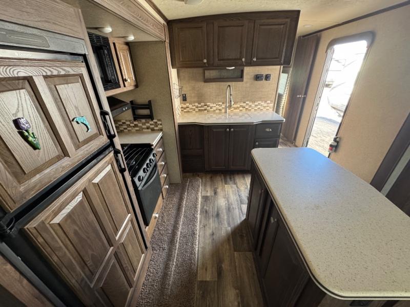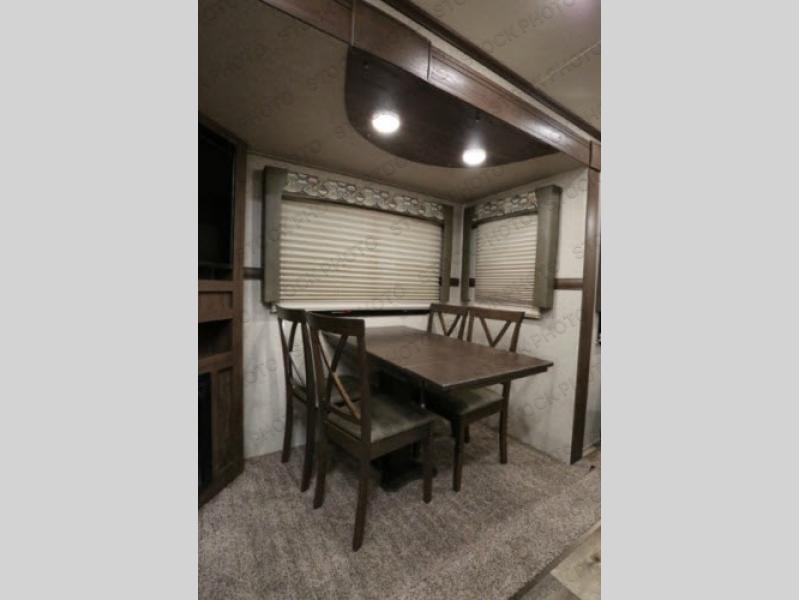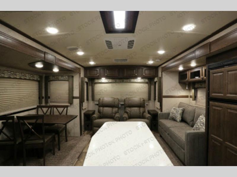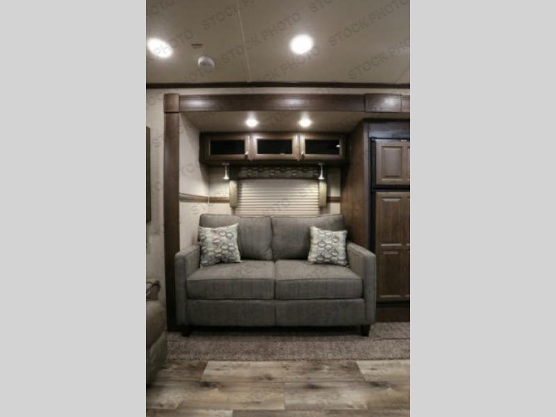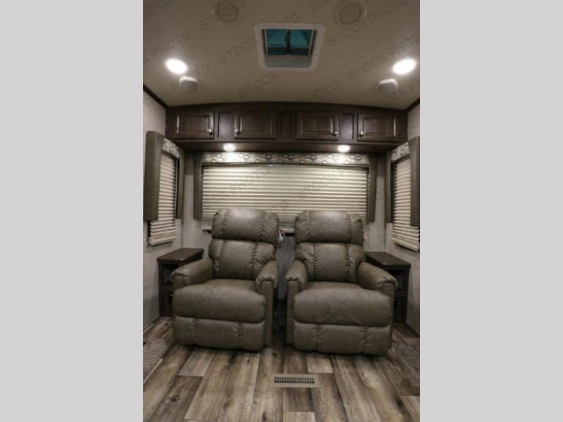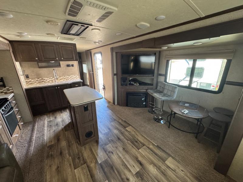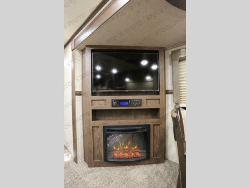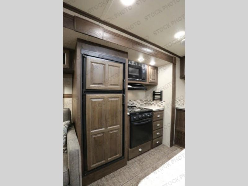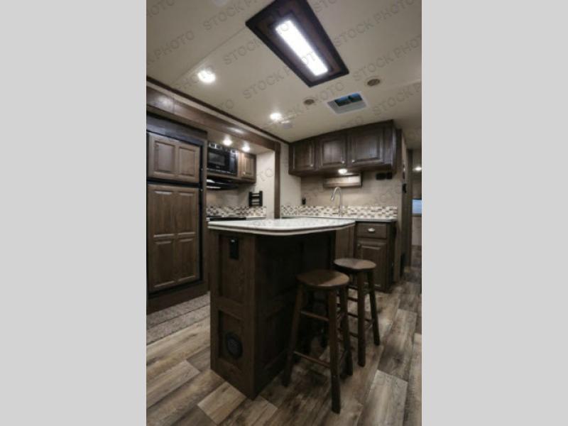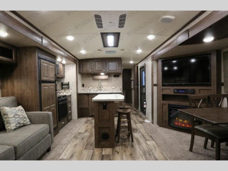 As you enter the travel trailer, to the left there is a slide with a corner entertainment center with a fireplace and a free-standing table and chairs. Along the rear wall you will find two recliners, and end tables. You can even choose optional Lazy Boy chairs in place of the recliners. The other slide has a hide-a-bed sofa, refrigerator, and three burner range. Next to the slide there is extra counter space and a large sink. The kitchen island also provides additional counter space and has two bar stools. Along the interior wall, straight in from the door you will find the double sink, an overhead cabinet, and more counter space for meal prep.
