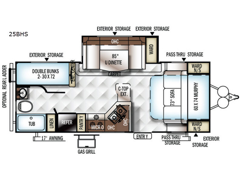 Outside you will find a 17' awning, a pass through storage area, plenty of exterior storage, a gas grill, and an optional rear ladder, plus so much more!