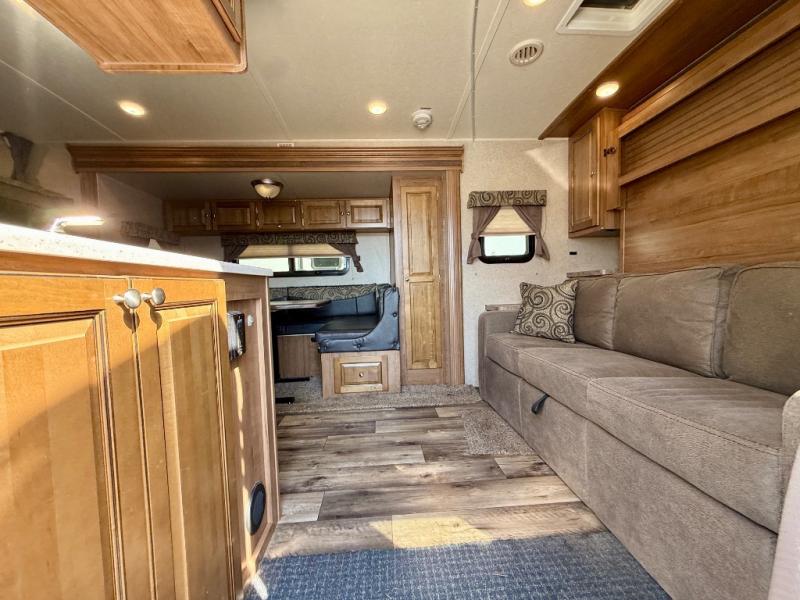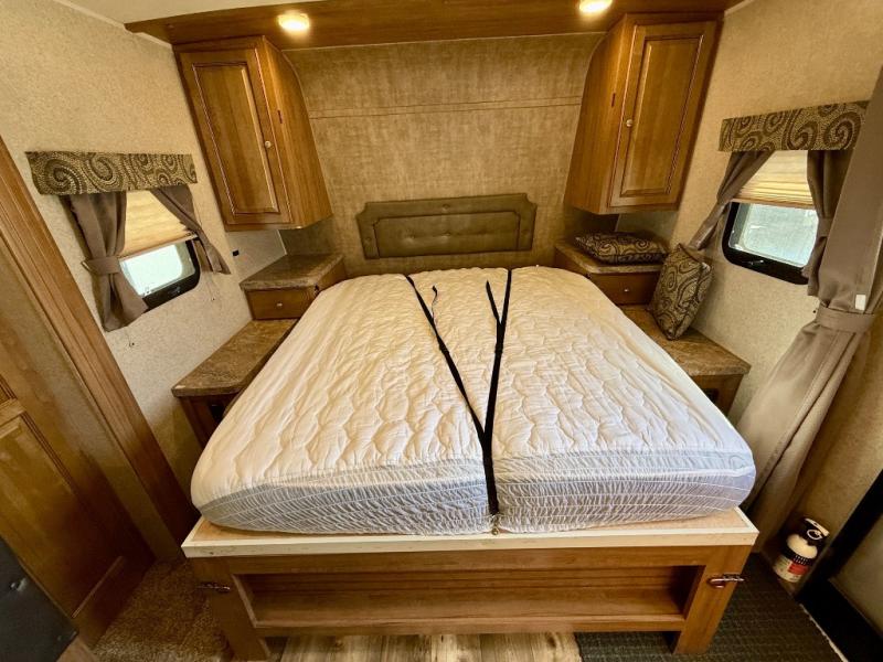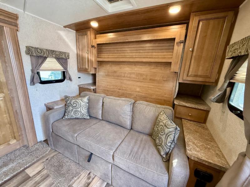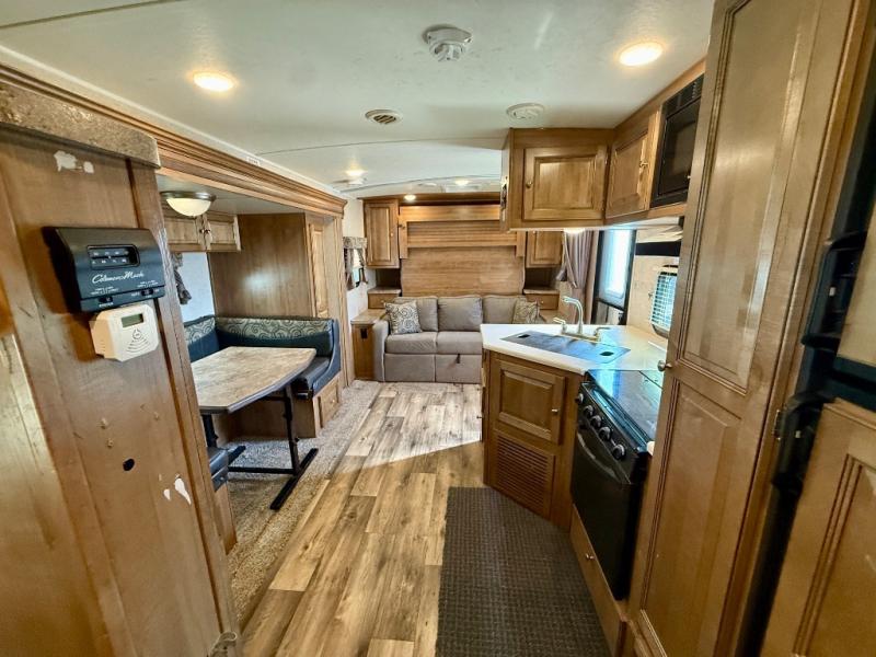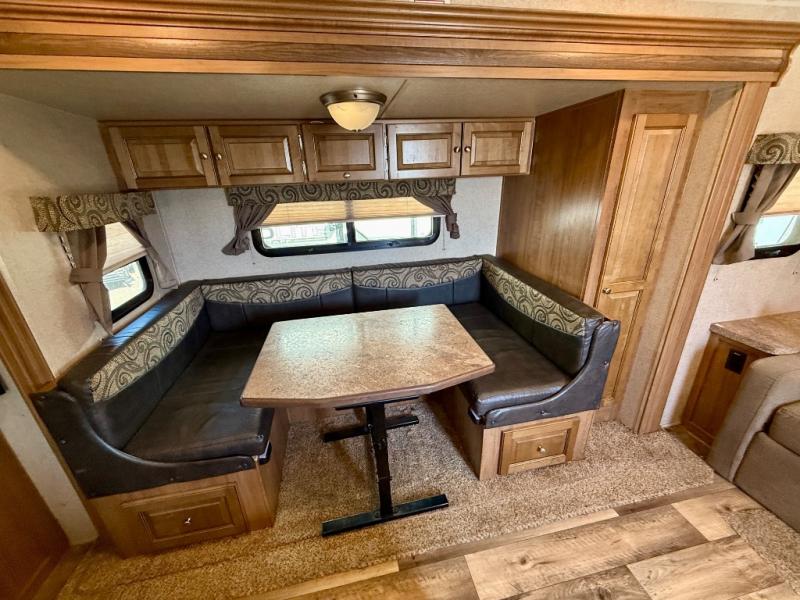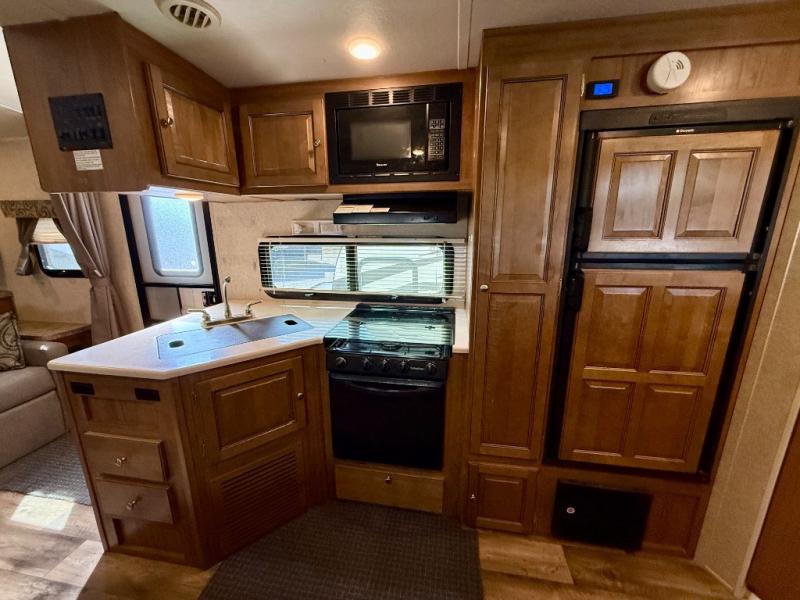 The slide out offers a u-dinette and a wardrobe. Next to the slide you will find an entertainment center. The opposite side of the trailer has a counter top extension, double kitchen sink, three burner range, microwave, pantry, and refrigerator.