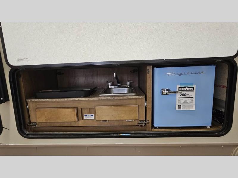 Outside fix a quick snack or dinner at the pull-out kitchen which features a two burner range, sink, and refrigerator. You will also find a gas grill, and an optional rear ladder. Your exterior camping gear can be stored in the exterior storage area and more!