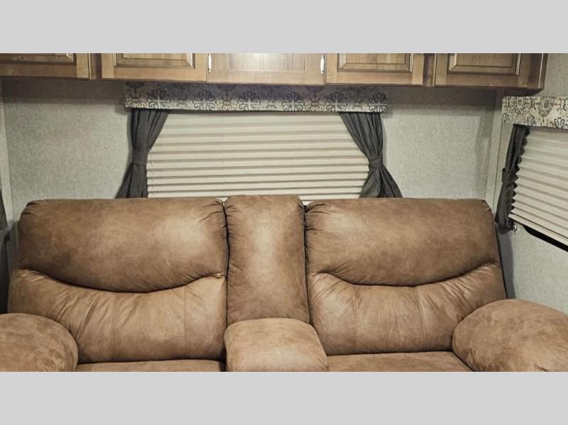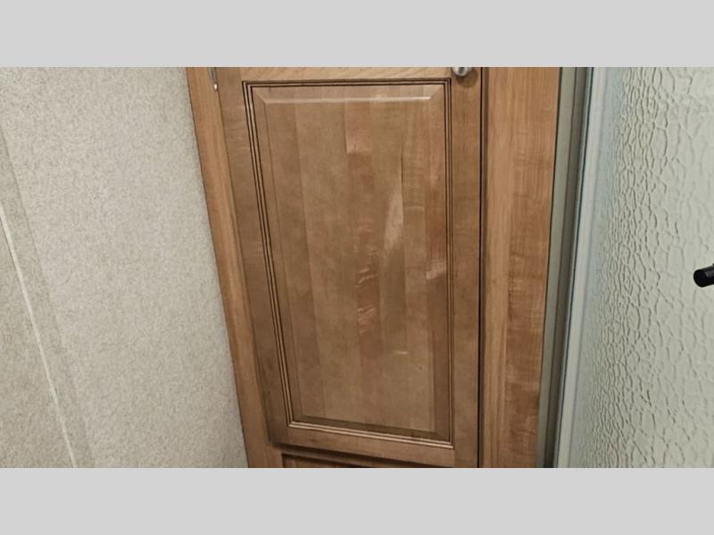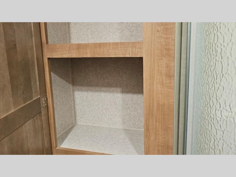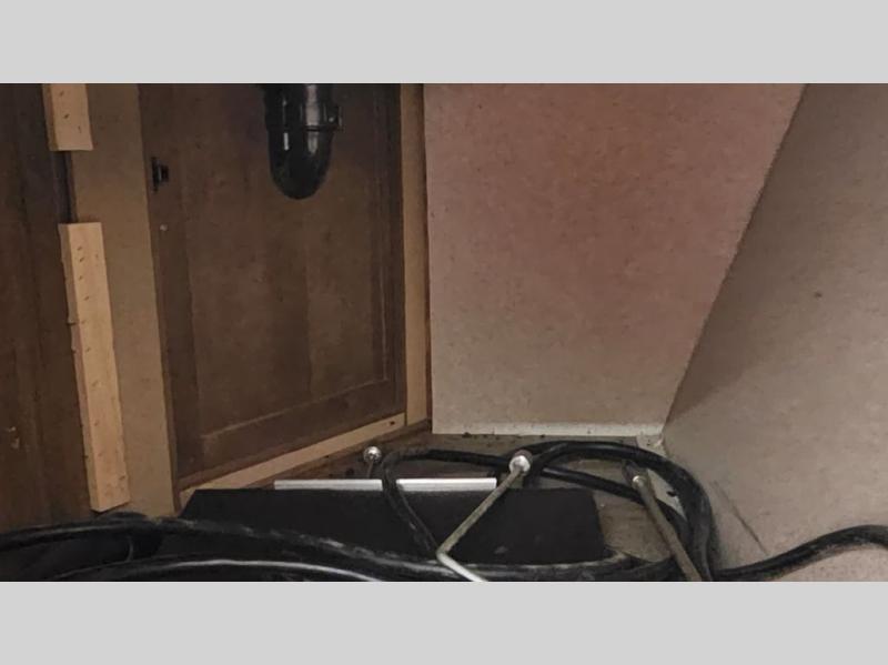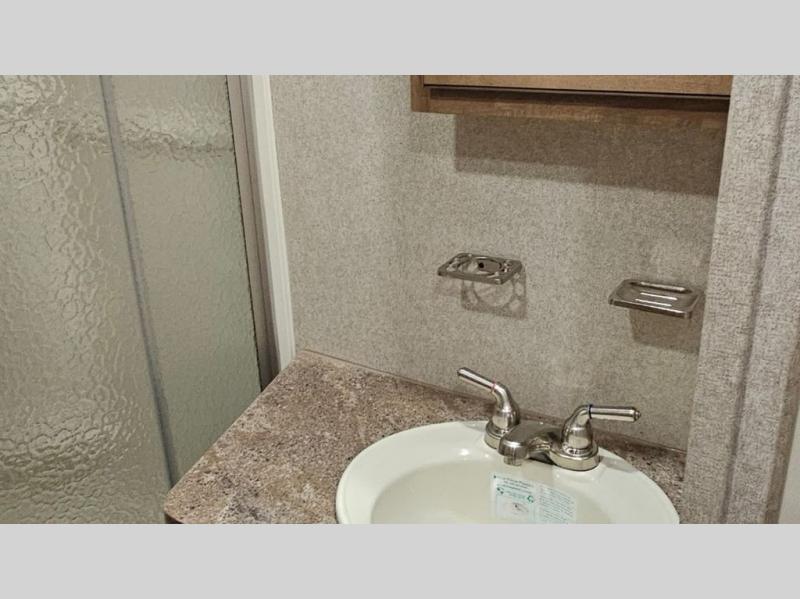 Step inside and find a refrigerator to the left, and on the wall outside of the bathroom there is an entertainment center which can easily be seen from the kitchen area. To the right of the entry door find a three burner range, microwave, double kitchen sink, large counter area with overhead cabinets, and a pantry. The u-dinette is on a slide and there is an overhead cabinet.