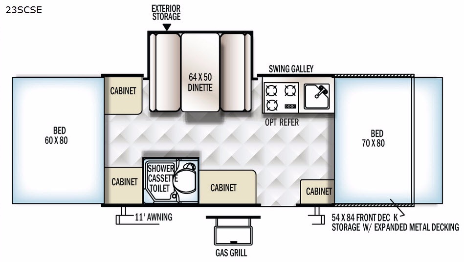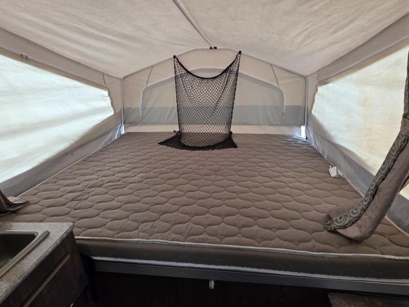 As you enter the camper, to the left there is a cabinet, shower and port-a-potty, and an additional storage cabinet. The opposite side of the camper has a cabinet, dinette slide out, swing galley, three burner range, sink, and optional refrigerator. In the front you will find a 70" x 80" king tent bed and in the rear a 60" x 80" queen tent bed.