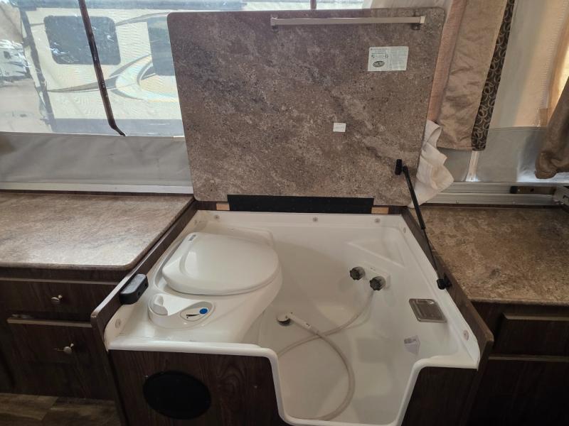 In StockA single slide out, a shower/porta potty cassette, and plenty of storage is what you will find inside the Flagstaff SE 23SCSE folding pop-up camper by Forest River. Plus there is an exterior front deck to store your toys and extra gear!