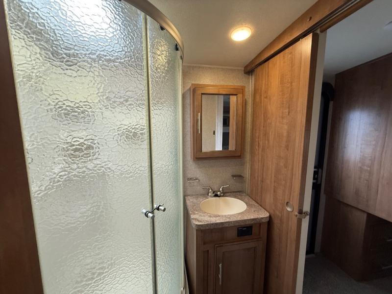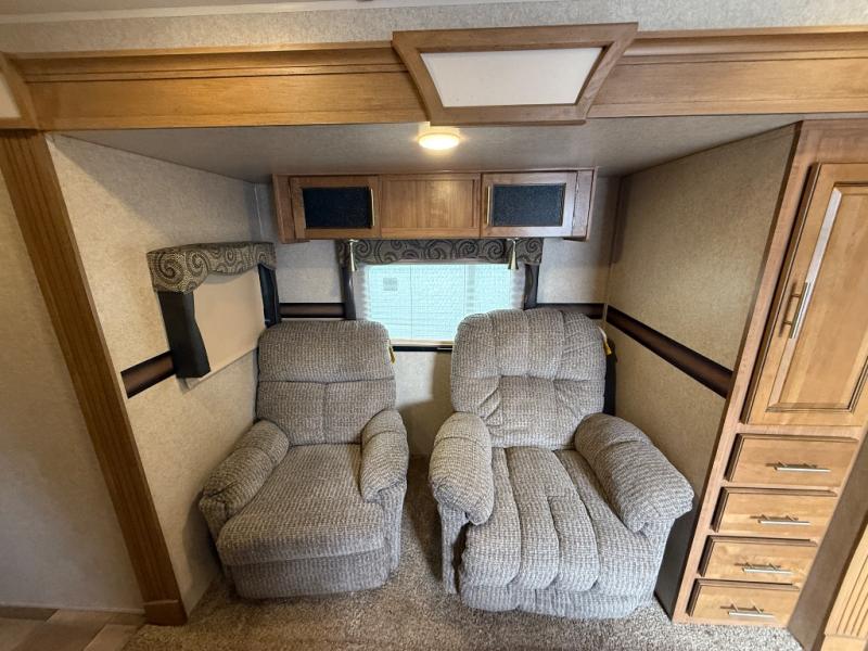 As you enter the main entrance of the trailer, along the front V-shaped wall you will find the kitchen with a three burner range, microwave, double sink, and a refrigerator. The road side slide has a pantry and hide-a-bed sofa or you can choose optional theatre seating. Across from the slide there is a dinette with an overhead LCD TV.