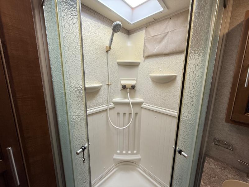 The side aisle bathroom has a linen cabinet for towels, a radius shower, sink, medicine cabinet, and toilet. There is also a private entrance from the bathroom into the bedroom.