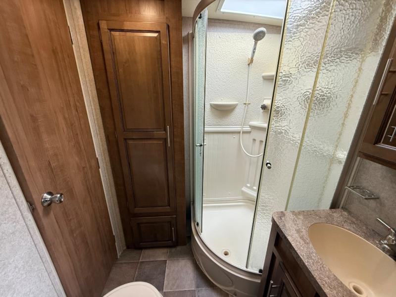 In the rear bedroom the slide helps to open up the floor space. The queen bed and nightstands are located on the slide. Across from the bed you will find a large wardrobe, and along the wall you can choose to add an optional swing arm TV. There is also a private entrance door leading outside from the bedroom.