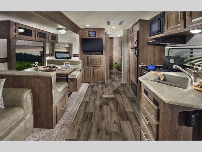 Stepping inside the main entrance of this 27VRL Flagstaff Super V Lite travel trailer you will find that you are in the living and kitchen area. Along the rear wall to your left, there are two swivel rockers or choose optional recliners. There are also two end tables and overhead storage as well. The road side slide has a hide-a-bed sofa or choose optional theatre seating, and a booth dinette. Or you can choose a free-standing table with chairs, plus a sofa or theatre seating, it's your choice. Adjacent to the slide you are sure to enjoy the entertainment center. The kitchen area has a c-top extension, double sink, three burner range, microwave, refrigerator, and a pantry.