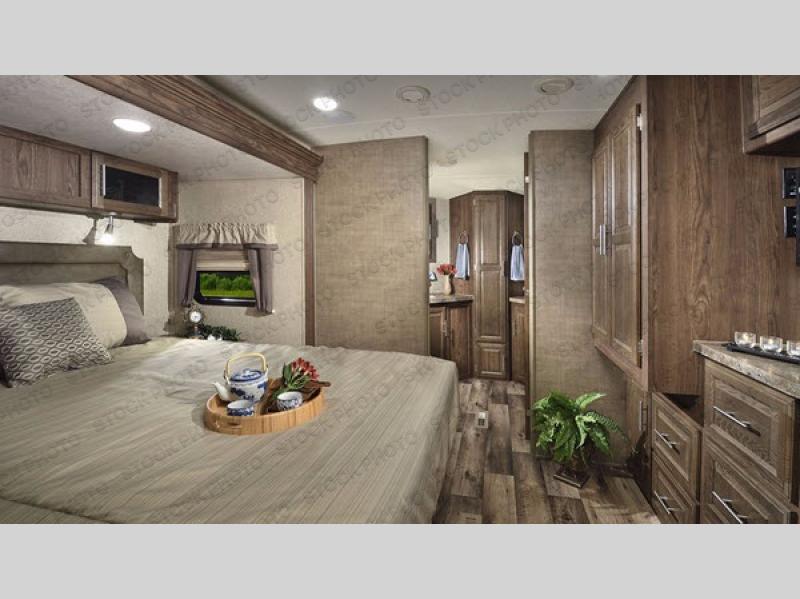 In the bedroom you will find a slide out with a queen bed and nightstands on either side of the bed. Across from the bed there is a large wardrobe, and along the wall you can choose to add an optional TV. There is also a private entrance door leading outside from the bedroom.
