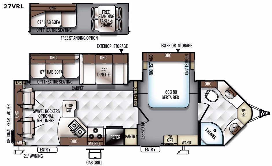 Outside you can choose to add an optional rear ladder, and if you enjoy grilling then you may want to use the gas grill. The awning helps to provide shade from the sun, and more!