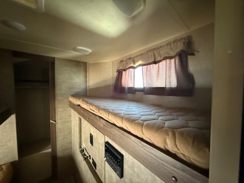 As you enter the main door to the right there is a pocket door entrance into the bunk house. There is a set of bunk beds on one side, a linen closet and shelves along the front v-nose wall, and a recessed TV above the top bunk on the other side.