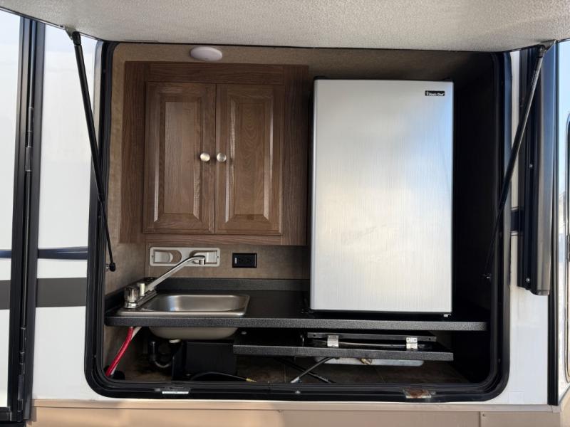 Outside you are sure to love the outside kitchen which offers a swing-out two burner stove, sink, storage, counter space, and a refrigerator. There are plenty of overhead cabinets throughout the travel trailer as well as exterior storage, a trunk door, and a bike door. You can even choose an optional gas grill, and more!