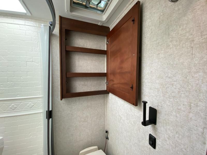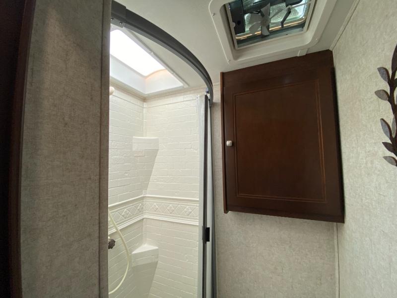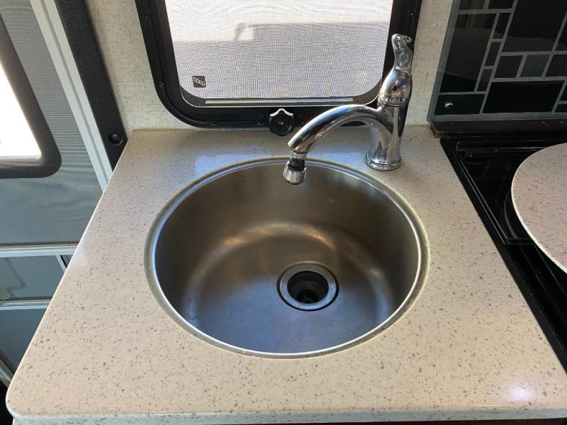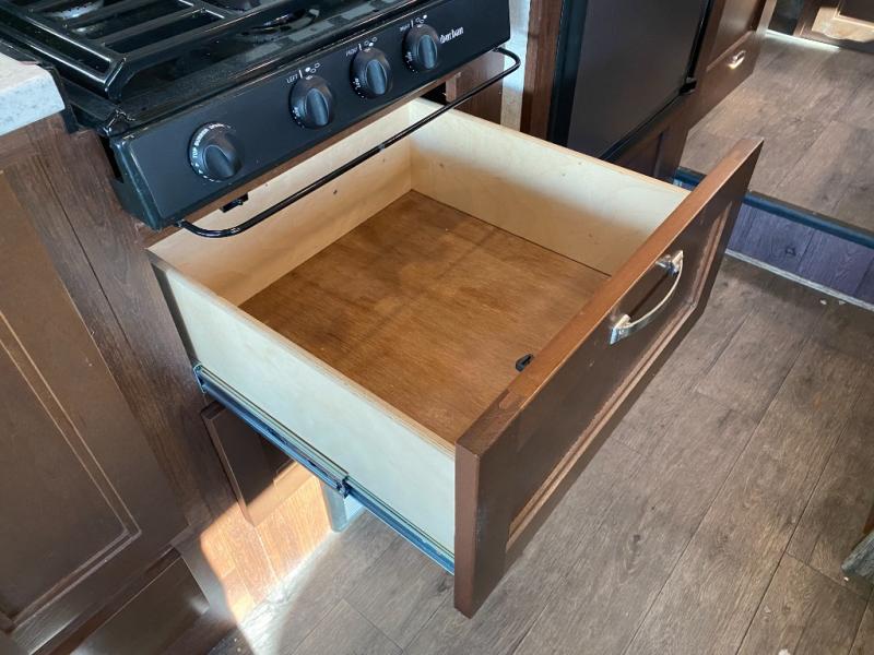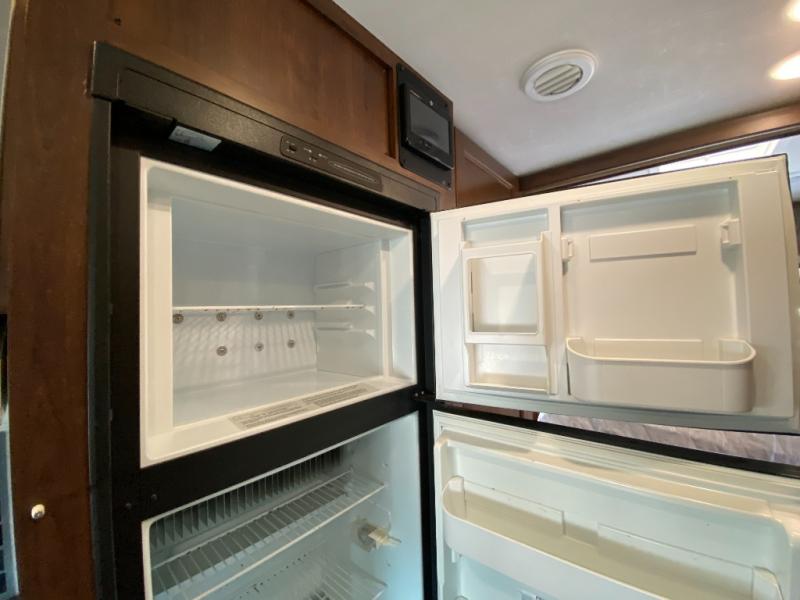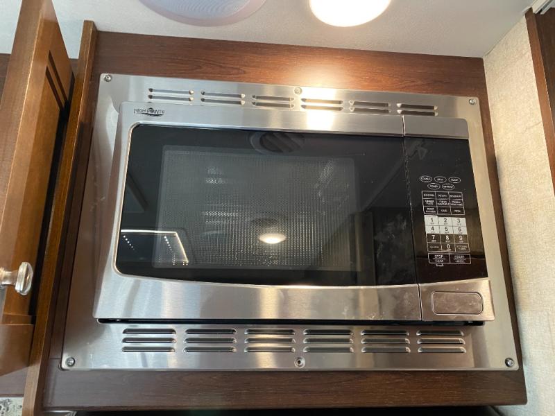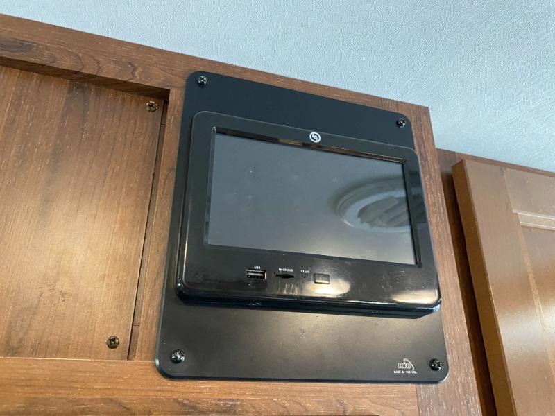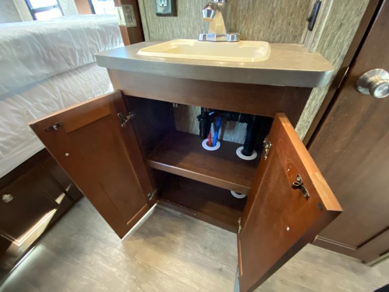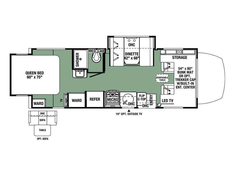 When you enter the motor home you will notice how spacious it seems with the slide out. The dinette, pantry, and wardrobe are all located within the slide. In place of the dinette there is an optional sofa with table. Along the opposite side of the motor home you will find a flip counter top, single sink, three burner range, microwave, and refrigerator. To the right of the entrance there is a LED TV.