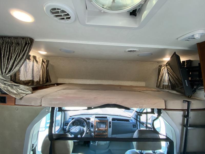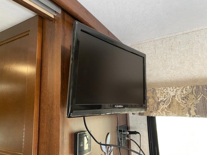 In the rear of the motor home there is a bed, overhead cabinets, and an optional TV along the wall.