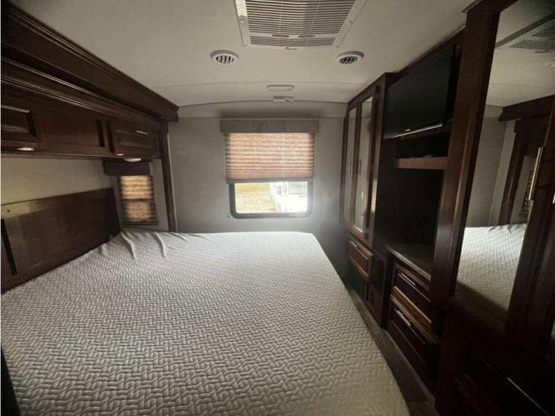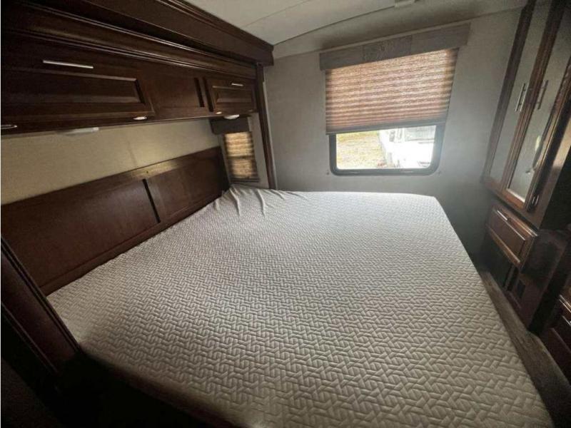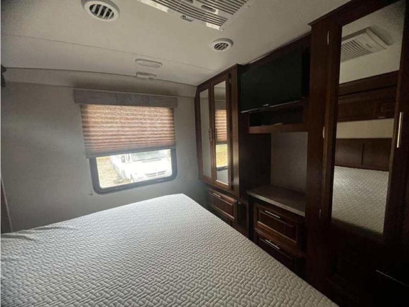 In the rear of the motor home, you will find a king bed slide with overhead cabinets, plus wardrobes and a LED TV on the opposite side.