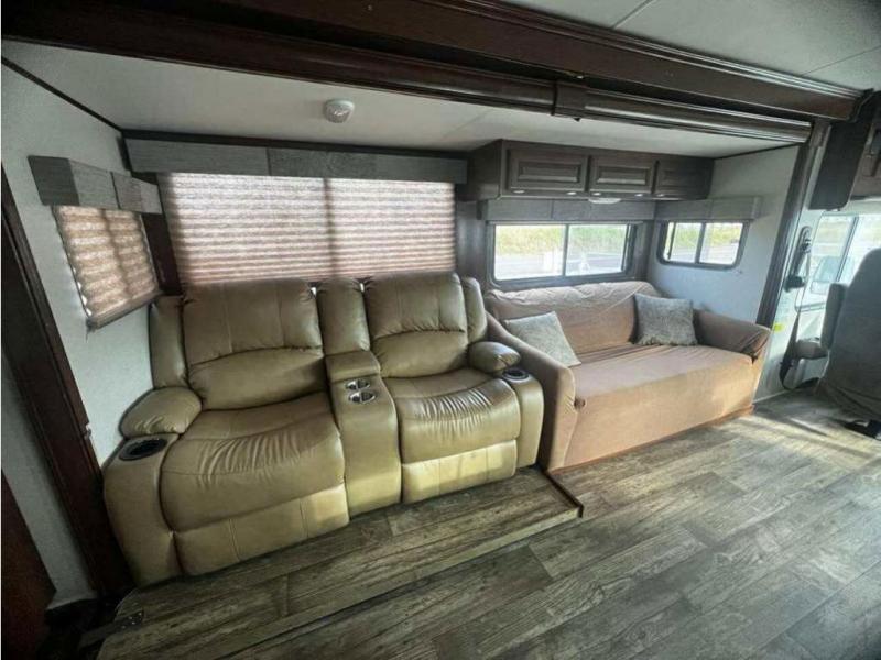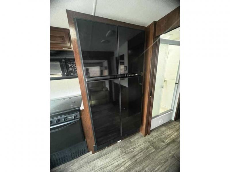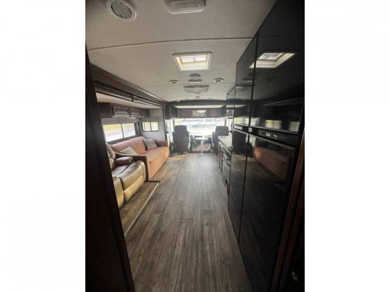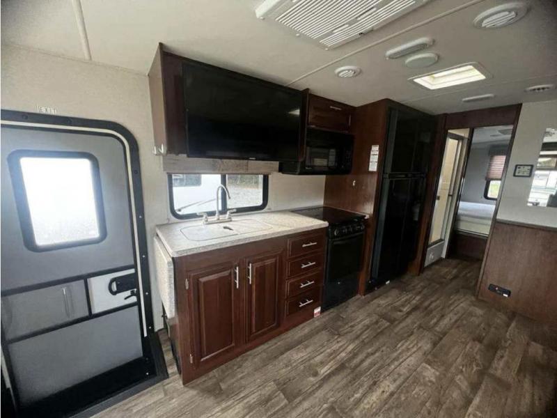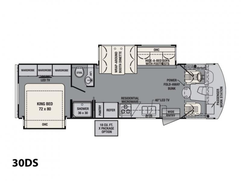 As you enter the motor home, on your left there is a double kitchen sink, 40" LED TV, countertop space, three burner range with residential microwave above, a refrigerator and pantry. You can choose an optional 18 cu. ft. refrigerator is you like. The opposite side offers a slide out hide-a-bed sofa with footrests and a wrap-around booth dinette.