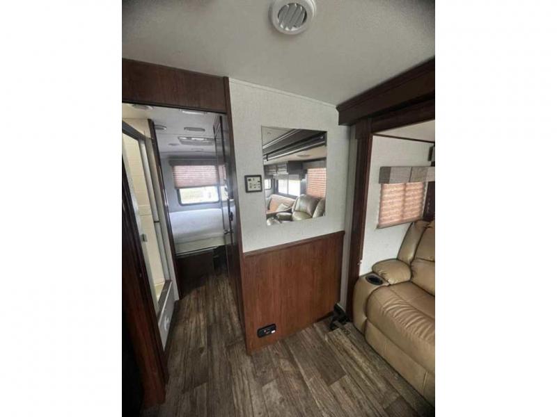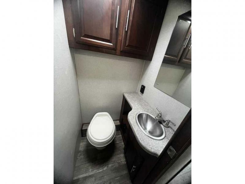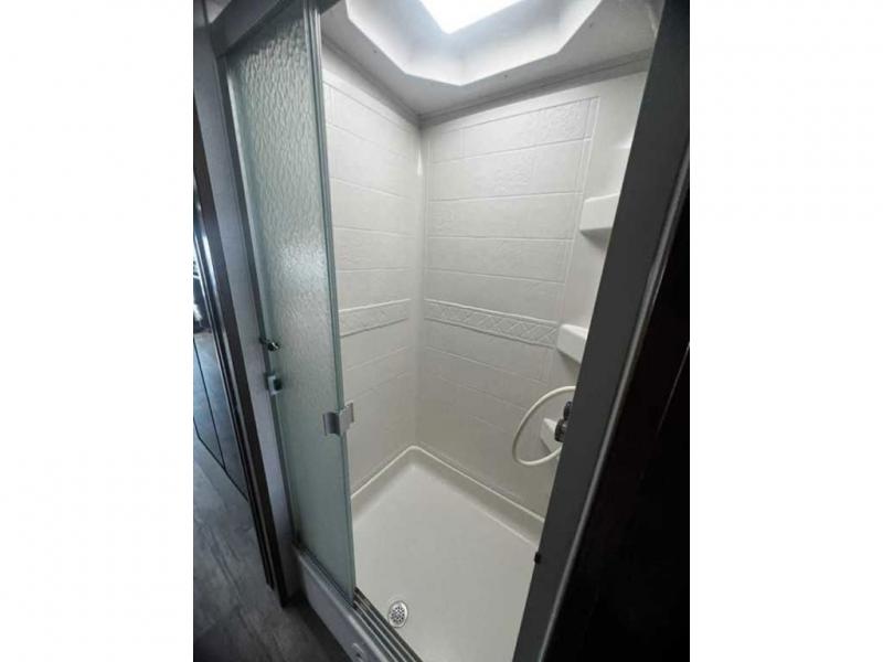 The walk-thru bathroom includes a private toilet area with a vanity sink on one side of the motor home, and a shower on the other side. You can choose to close the sliding doors for privacy for a full bath.
