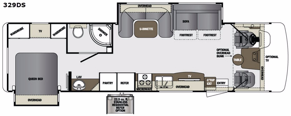 When you step inside this Georgetown by Forest River you will be in the kitchen and living area. With a slide in the main living area you will appreciate how open and spacious this motor home feels. As you enter to your left there is a counter extension, TV, double kitchen sink, three burner range, and a microwave. A refrigerator or you can choose an optional stainless residential refrigerator, and a pantry complete the kitchen amenities. The opposite side features a sofa with footrests, and a u-shaped dinette slide. Both of these provide extra sleeping space at night when needed.
