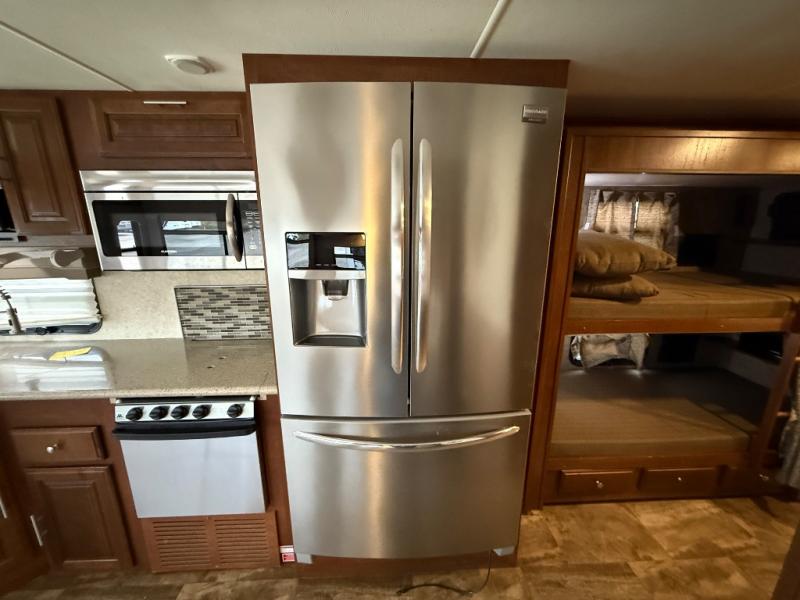 You will be wowed by the space and beauty inside the kitchen/living area. There is a slide with a hide-a-bed sofa including footrests, and dinette with overhead cabinets. On the opposite side you will find a double kitchen sink, overhead TV, three burner range with microwave above, refrigerator or you can choose an optional stainless residential refrigerator, and a pantry.