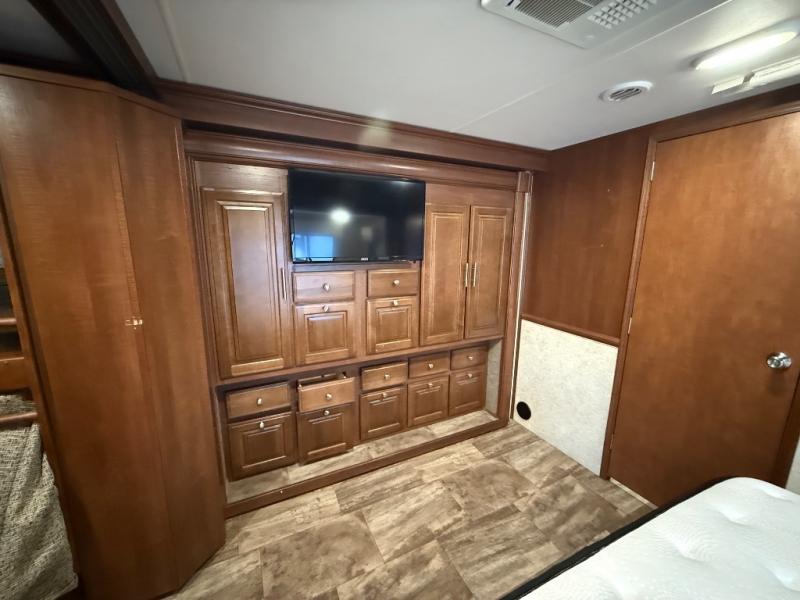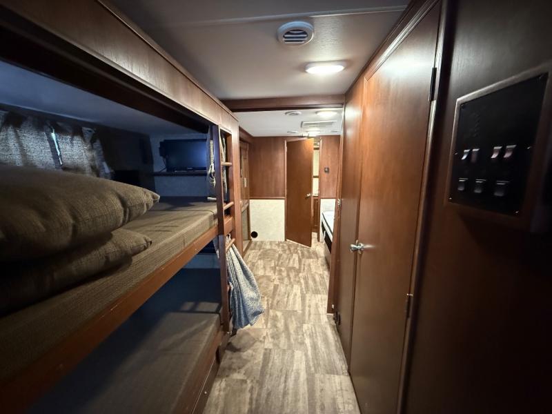 Across from the bathroom and leading into the bedroom there is a slide with a set of bunk beds, plus a large wardrobe and TV inside the bedroom. Across from the wardrobe you will find a slide out king bed with nightstands and overhead storage.