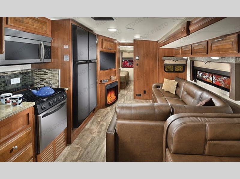 As you step inside model 31L5, to your right you will find the cab area with a table between the driver and passenger chairs for your morning cup of joe. You can even choose to add the optional power overhead bunk above the cab if you need more sleeping space.