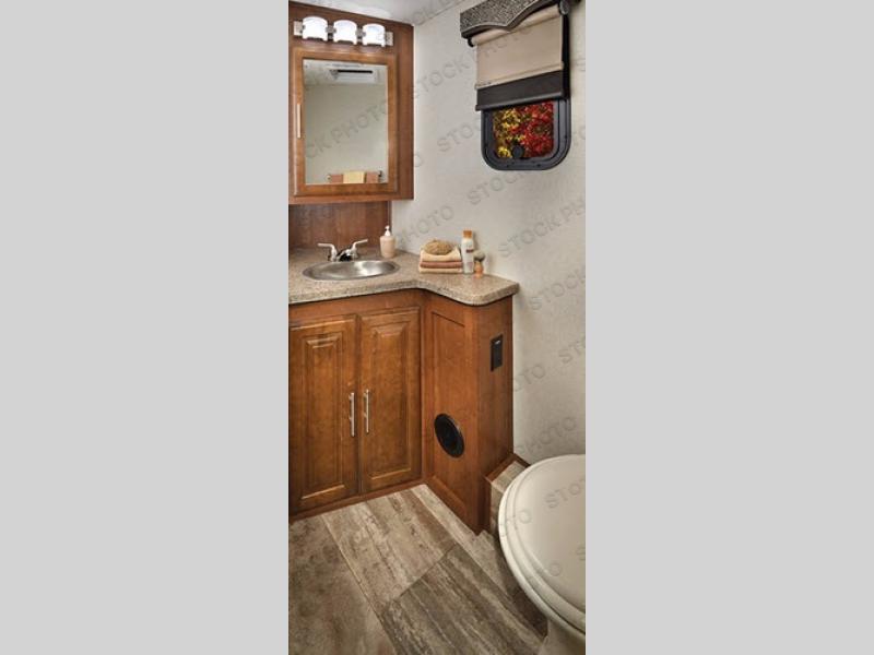 Along the road side wall the first slide out provides a Dream dinette and L-shaped sofa including overhead storage to keep your things neat and tidy. Along the outer wall of the bathroom you will find a TV and fireplace.