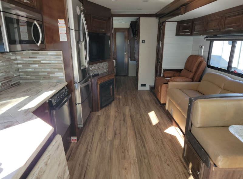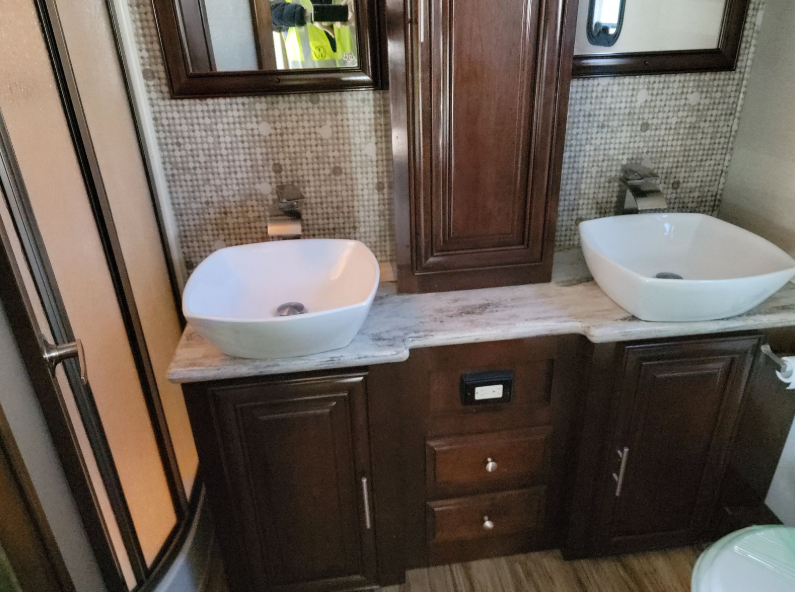 Step inside this Georgetown XL class A gas motorhome 369DS by Forest River to find comfort and luxury with double slides, dual sinks in the rear master bath, and a half bath for family and friends, plus more!