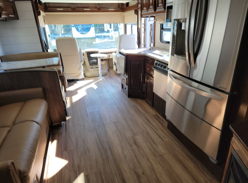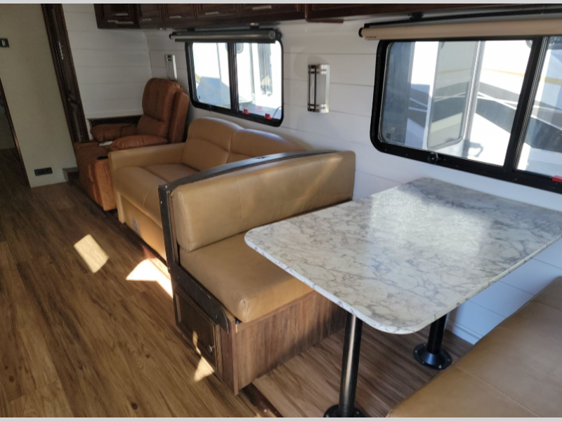 The road side slide in the main living area has a dinette or you can choose an optional free-standing dinette and chairs, an L-shaped sofa, and a wardrobe just across from the half bath.
