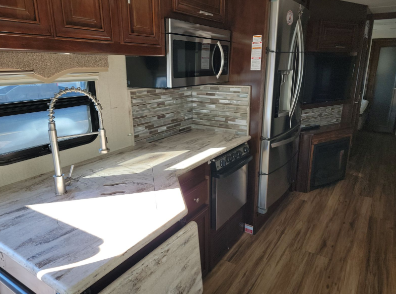To the left of the entrance you will find a counter top extension, a double kitchen sink, three burner range with microwave above, and a stainless residential refrigerator. The TV and fireplace are on an angle and can easily be viewed and enjoyed from the L-shaped sofa opposite.