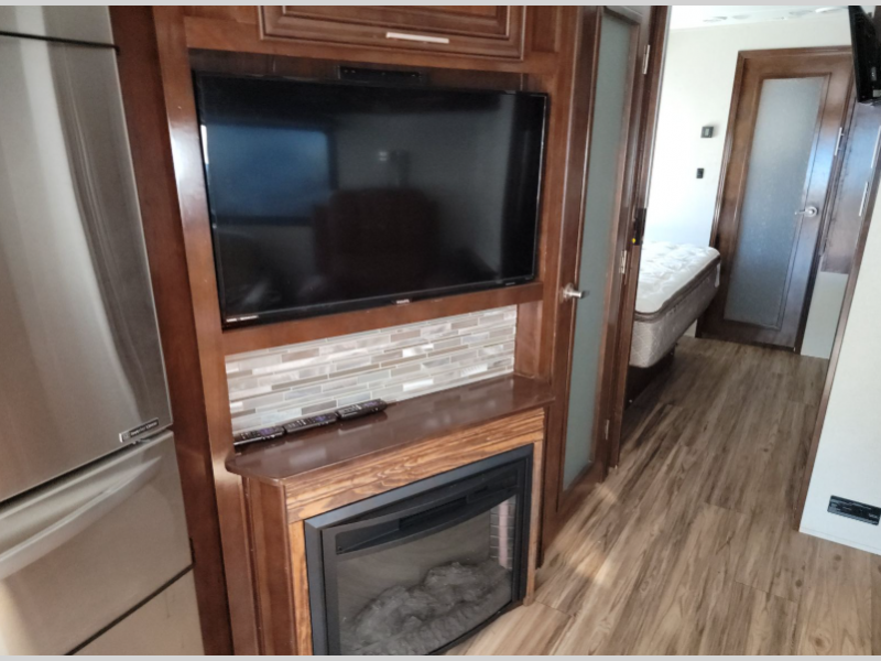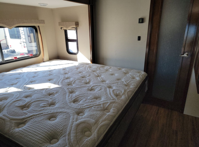 The walk-through bedroom features a king bed slide with overhead cabinets. There is also a wardrobe, TV, and optional washer and dryer.