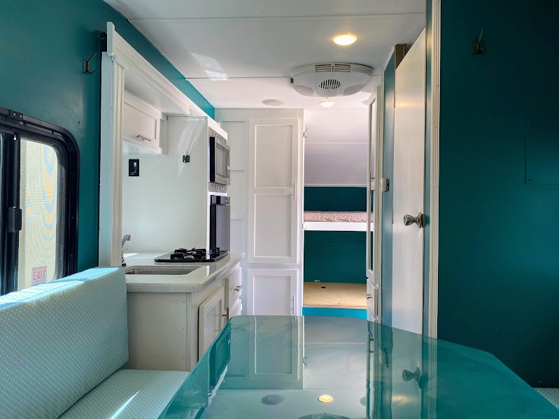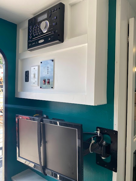 To the left of the entry door you will find an entertainment center along side a wardrobe for clothing storage. You can add a TV if you wish that would easily be viewed from the bunks.