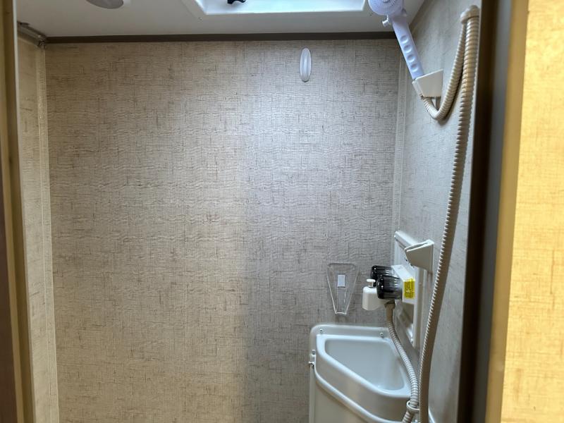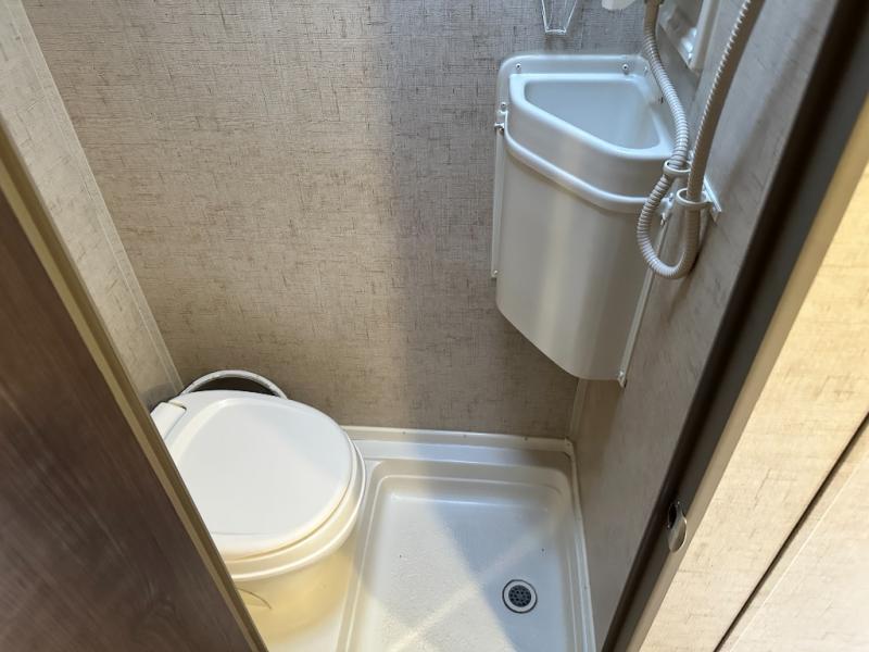 Along the curb side you will find a convenient wet bath featuring a toilet, shower, and corner sink. There is a wardrobe for clothing storage just outside the bathroom along the curb side between the bath and the front queen size bed.
